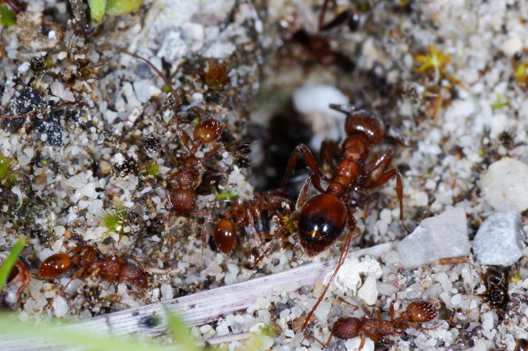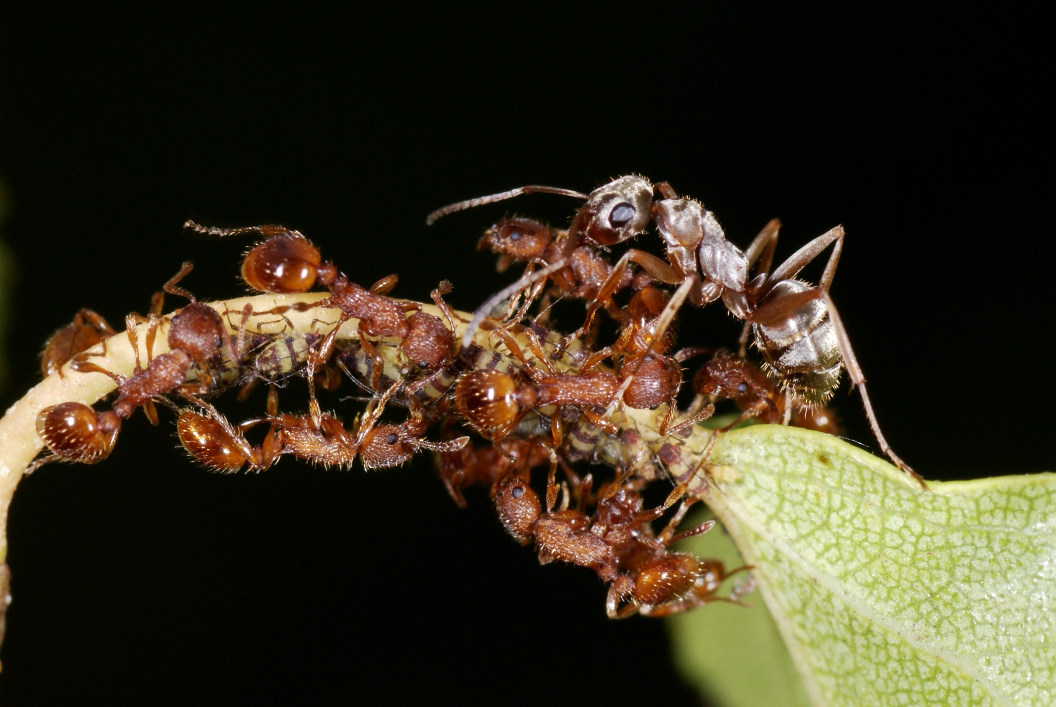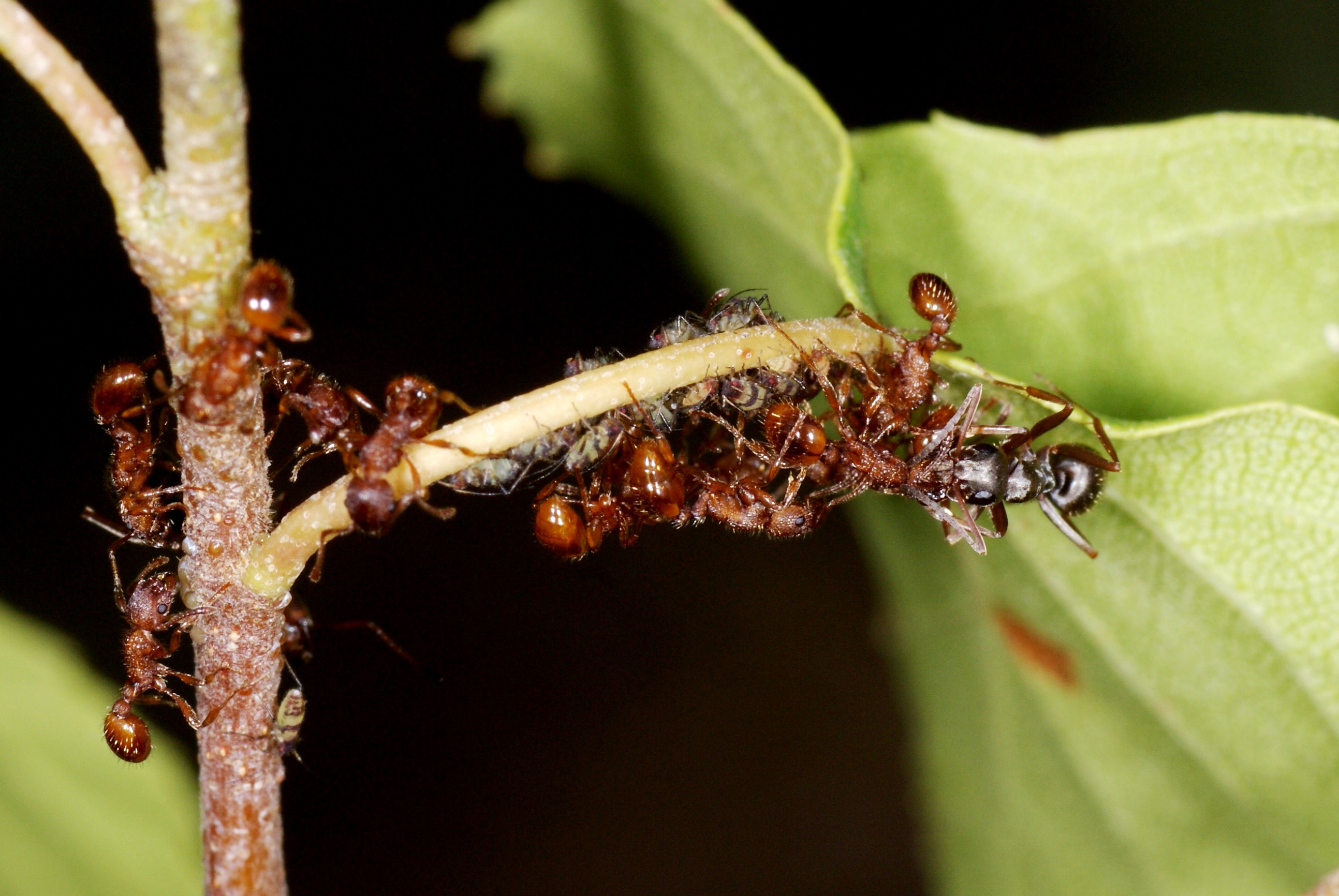 Schon vor ein paar Jahren konnte ich eine seltsame Interaktion zwischen Formica fuscocinerea und Myrmica sp. (damals nicht bestimmt!) beobachten, die auch im alten AF vorgestellt wurde. Etliche Arbeiterinnen v. Myrmica sp. betreuten Blattläuse auf einer Pflanze; nichts ungewöhnliches, aber einige Arbeiterinnen f. Formica fuscocinerea spazierten dazwischen, versuchten das eine od. andere Mal eine Myrmica aufzuheben und wegzutragen um sie dann nach wenigem cm wieder abzusetzen. Die Vermeidungsstrategie der Myrmica sp. bestand in devotem Verhalten, es gab kein Anzeichen für Aggression od. Verteidigungsbereitschaft des Nahrungsplatzes. Wurde eine Myrmica belästigt oder aufgehoben, machte sie sich "steif" und verhielt sich ruhig. Die Formica ließen keine selbständige Nahrungsaufnahme erkennen, möglicherweise verhielten sie zögerlich, weil sie zahlenmäßig in der Unterzahl waren. Dann aber machte ich eine kuriose Entdeckung: Eine Formica fasste mit den Mandibeln eine Myrmica im Kopfbereich an und prompt würgte diese einen Futtertropfen hervor!