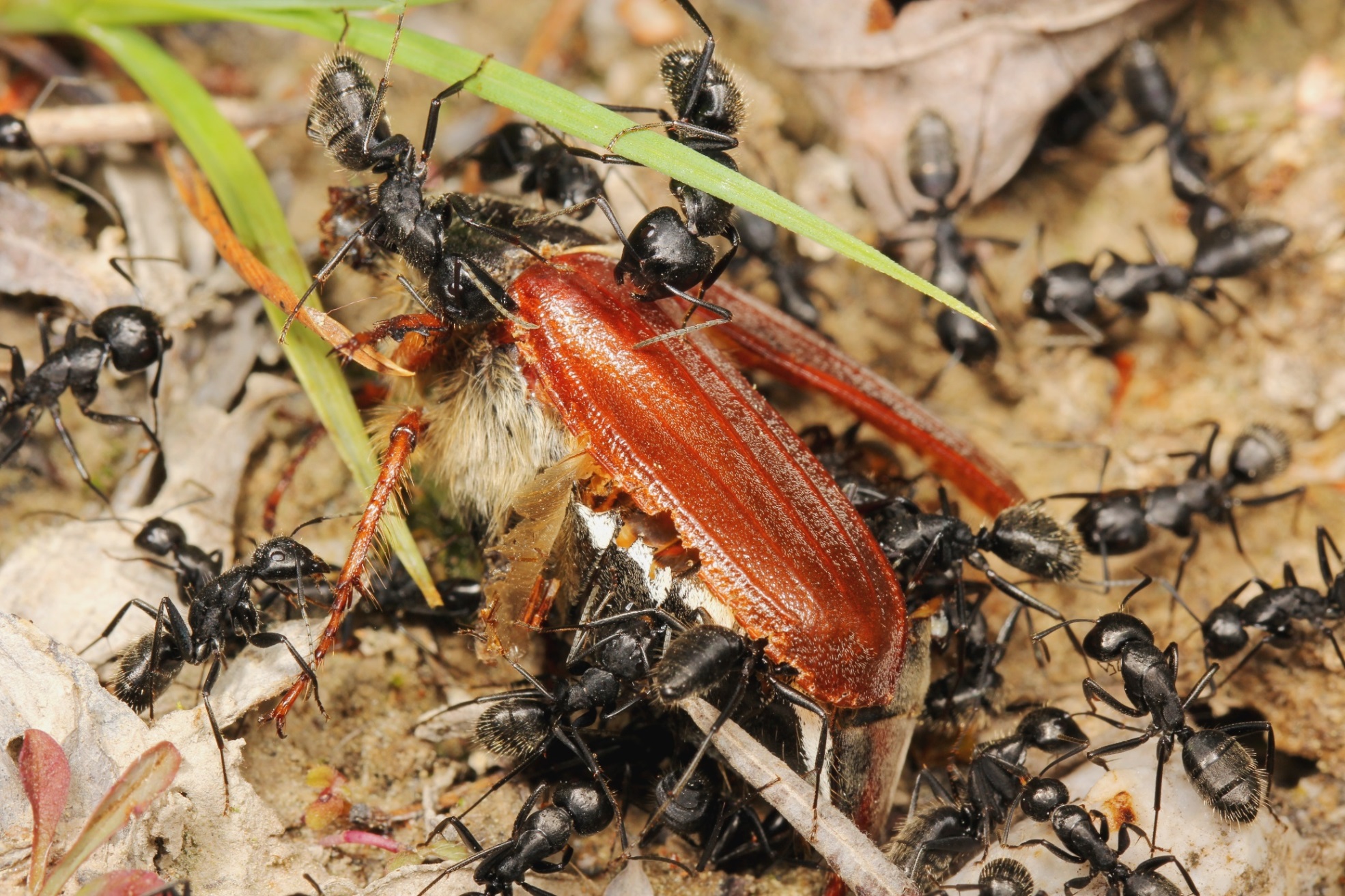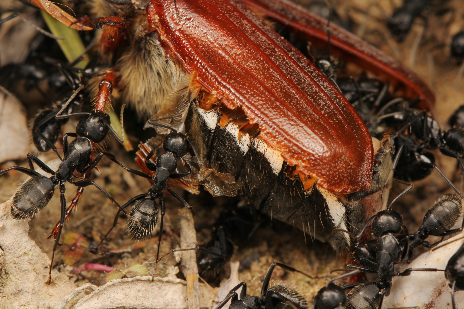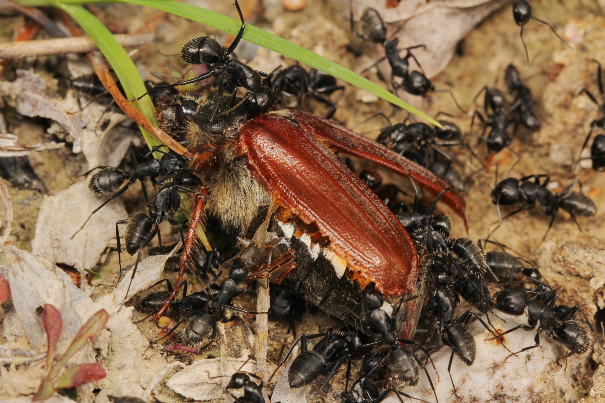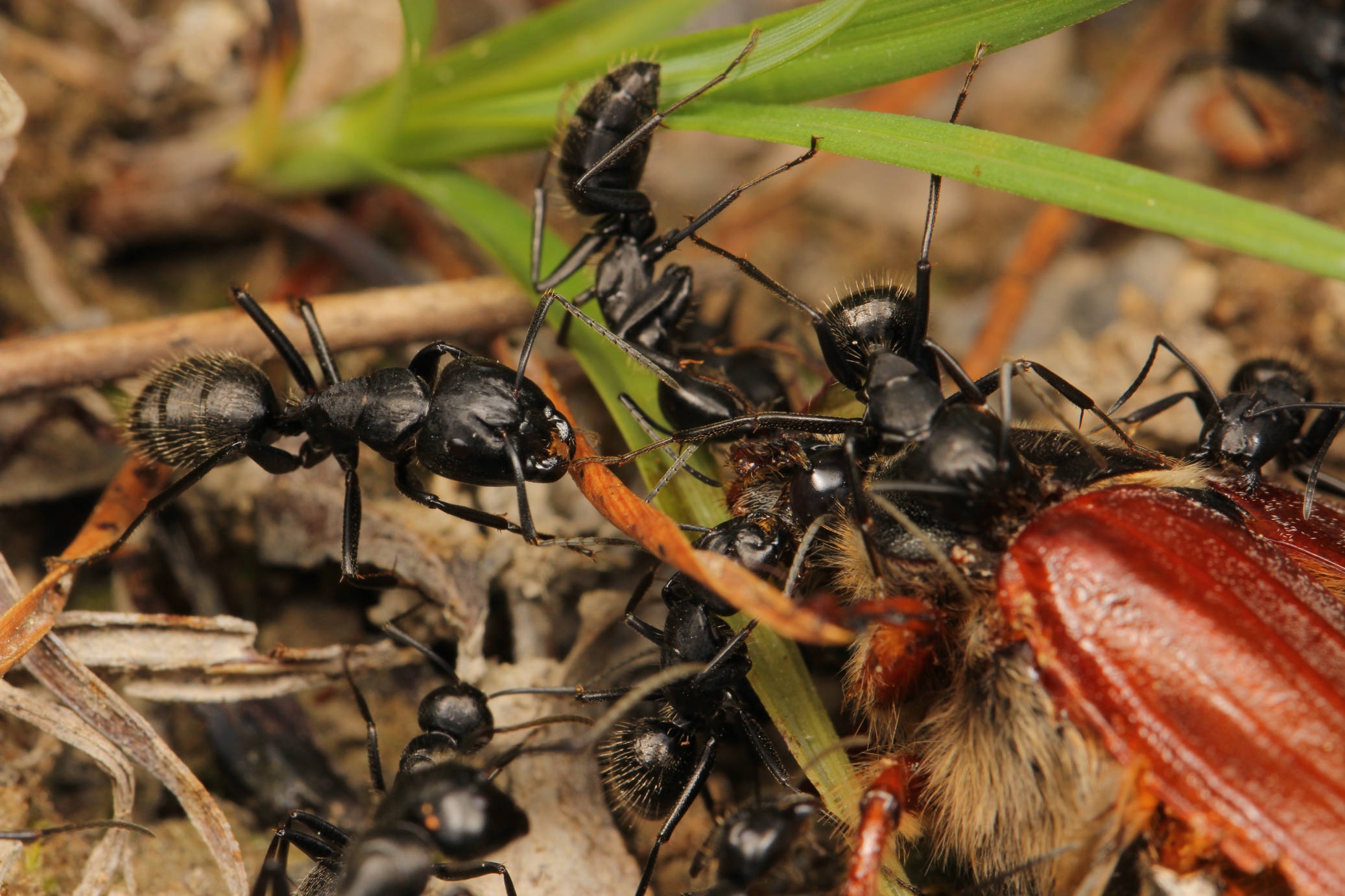 Heute war ich mit Sohn Roman und Hund Sarah aber wieder in der Wildnis, in Südkärnten, in meinem geliebten Schneeheide-Rotföhrenwald, der so vielen interessanten Tieren als Heimat dient. C. vagus-Arbeiterinnen waren mit einem Opfer "beschäftigt", so weit man es erkennen kann, dürfte es sich um einen Maikäfer handeln, der sein kurzes Leben ausgehaucht hat. Aas wird von vielen Ameisenarten beseitigt und das ist gut so!