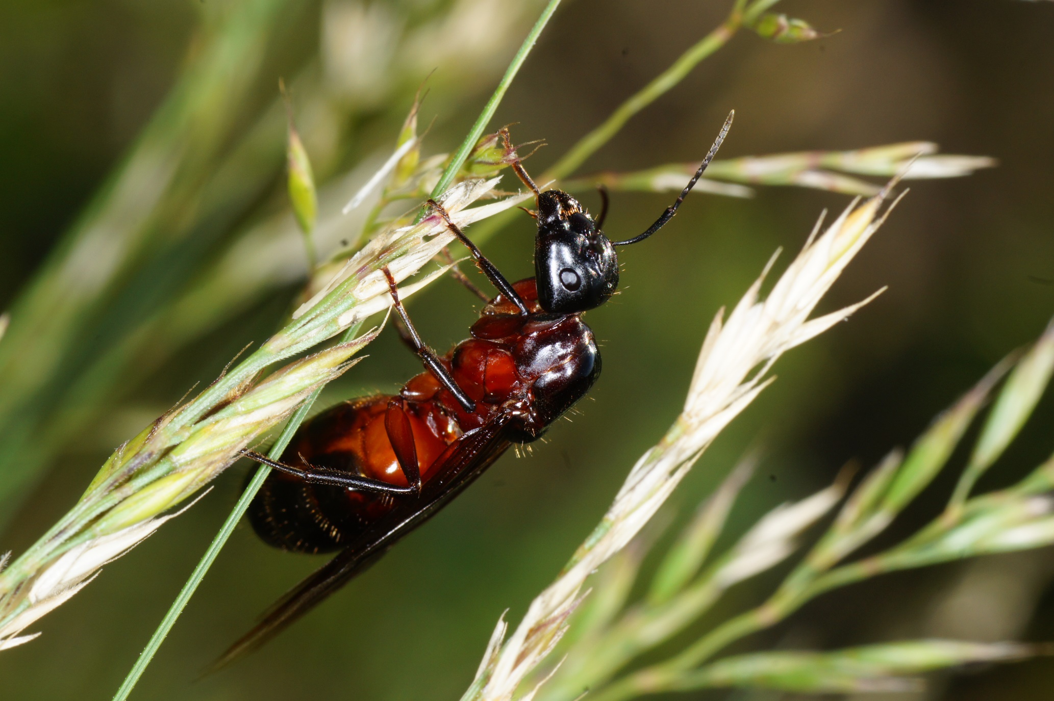 Bemerkung: Das Schwärmen v. F. rufa liegt zumindest bei diesem Beobachtungsnest in den letzten Zügen: Wenige Geschlechtstiere turnten die Grashalme in die Höhe; ich habe den Eindruck gewonnen, dass es sich um Nachzügler handelte, teilweise "flugbehindert!" Ein Männchen habe ich mitgenommen, schon nach dem Heimtransport war das Insekt stark geschwächt.