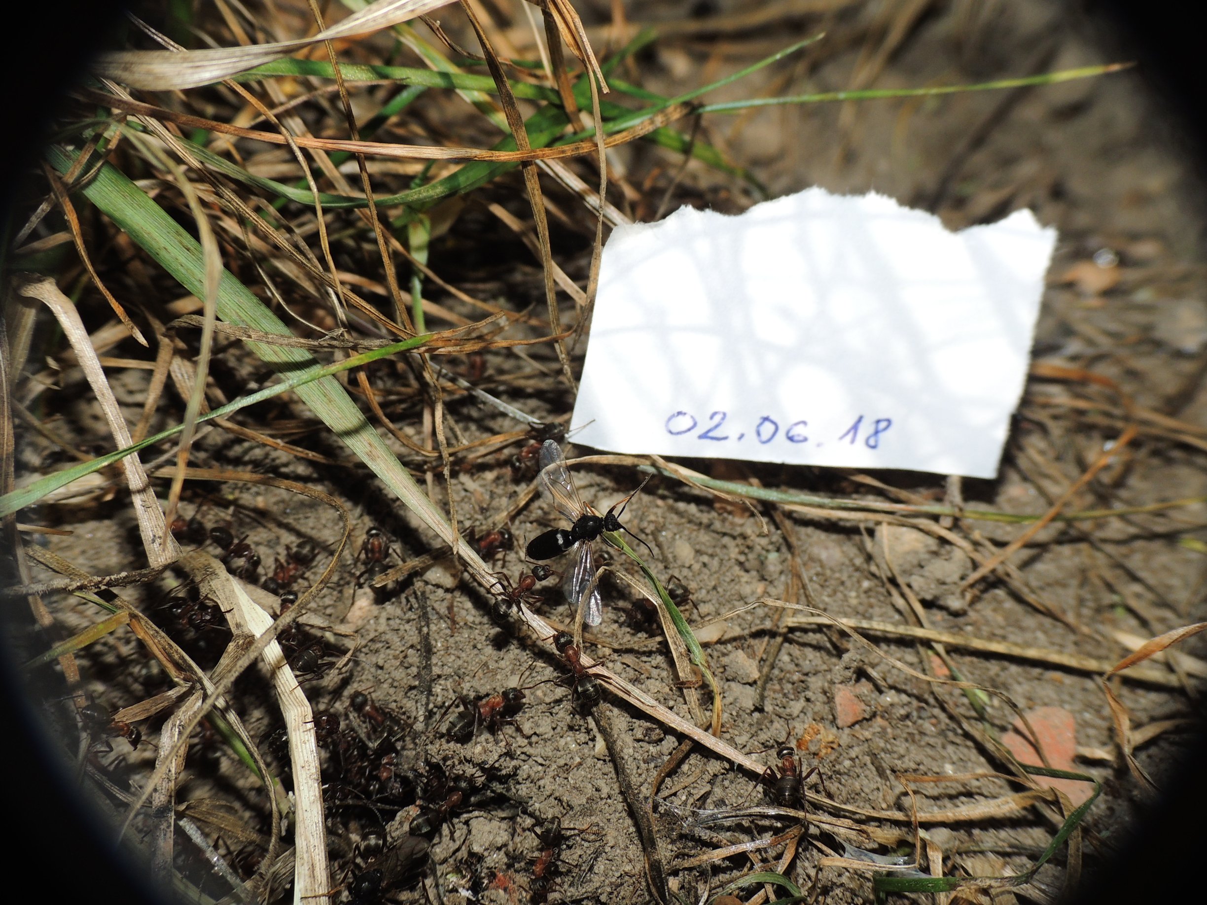 Bemerkung: Wahrscheinlich handelt es sich wieder um eine Gyne aus meinen 2 Formica fuscocinerea-Nestern in der Nähe der Fundstelle. Ich hab ein (schlechtes) Foto gemacht, weil man Gynen der Art kaum jemals im Forum sieht. Die Gynen sind zarter gebaut als etwa jene von F. rufibarbis. Sie sind extrem schnell unterwegs und wirken hochgradig "nervös". Ich habe das Tier nach mehreren erfolglosen Flugversuchen auf einen Busch gesetzt und musste dann feststellen, dass es auch von der Höhe aus nicht starten konnte und offenbar flugunfähig war. Ich habe es seinem Schicksal überlassen.