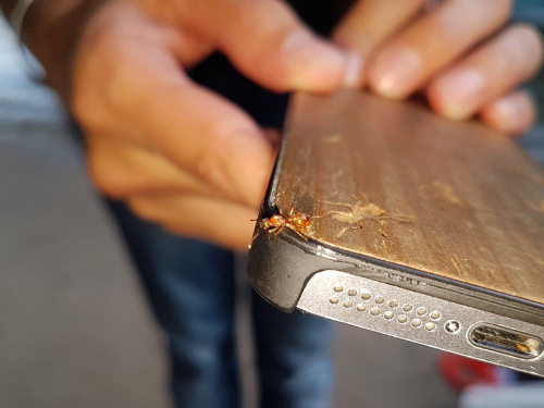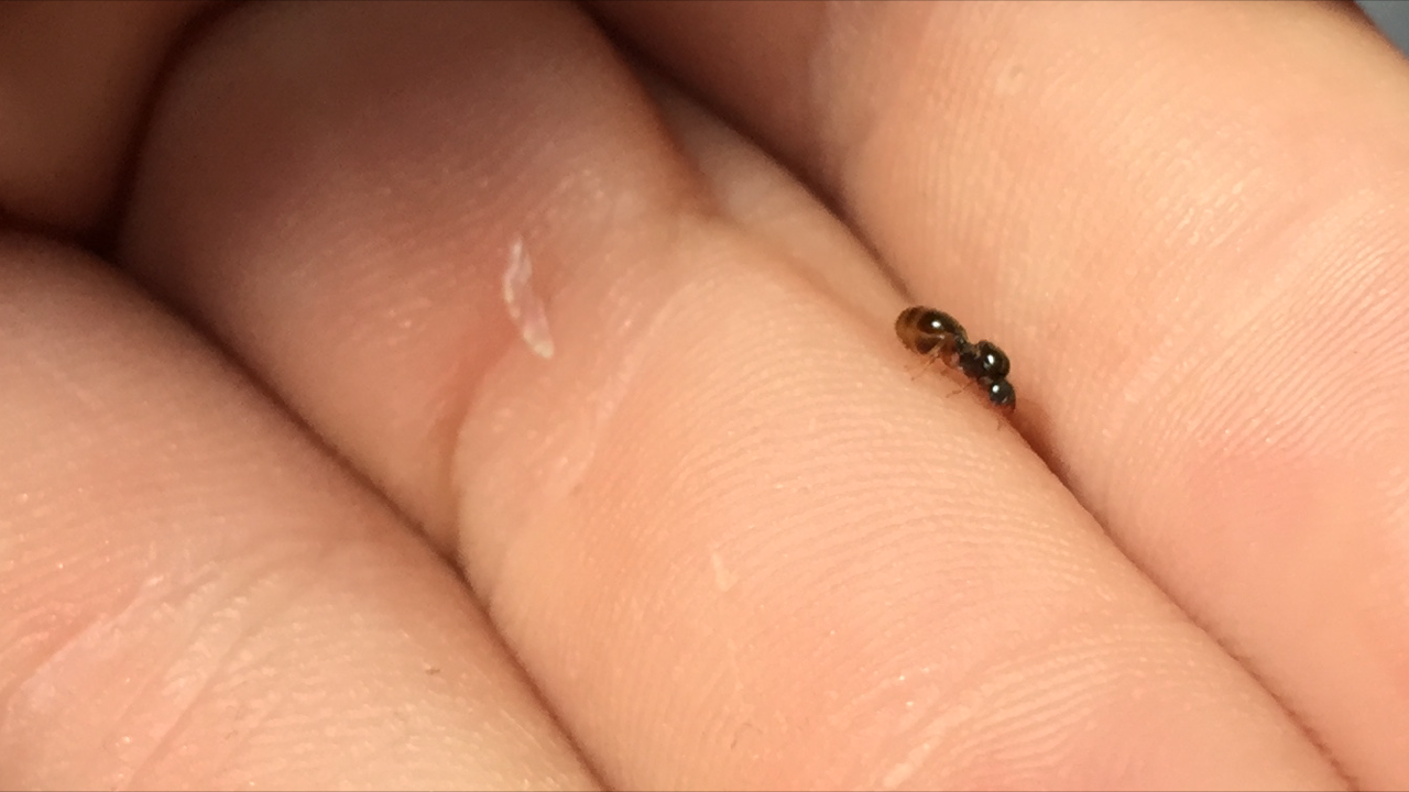 Temnothorax affinis, die ebenfalls häufig in meinem Garten ist. Erst morgens habe ich es unter Alkohol gesetzt und unter dem Bino bestimmt. Die Bilder zeigen sehr schön die charakteristischen Merkmale(Schuppe nach vorn geneigt; Propodeum nach hinten leicht überhängend; je zwei helle Flecken links und rechts auf der Gaster). – Für Bedenkenträger: Das eine Tier ist kein nennenswerter Verlust; die Art ist offenkundig in Ausbreitung.
