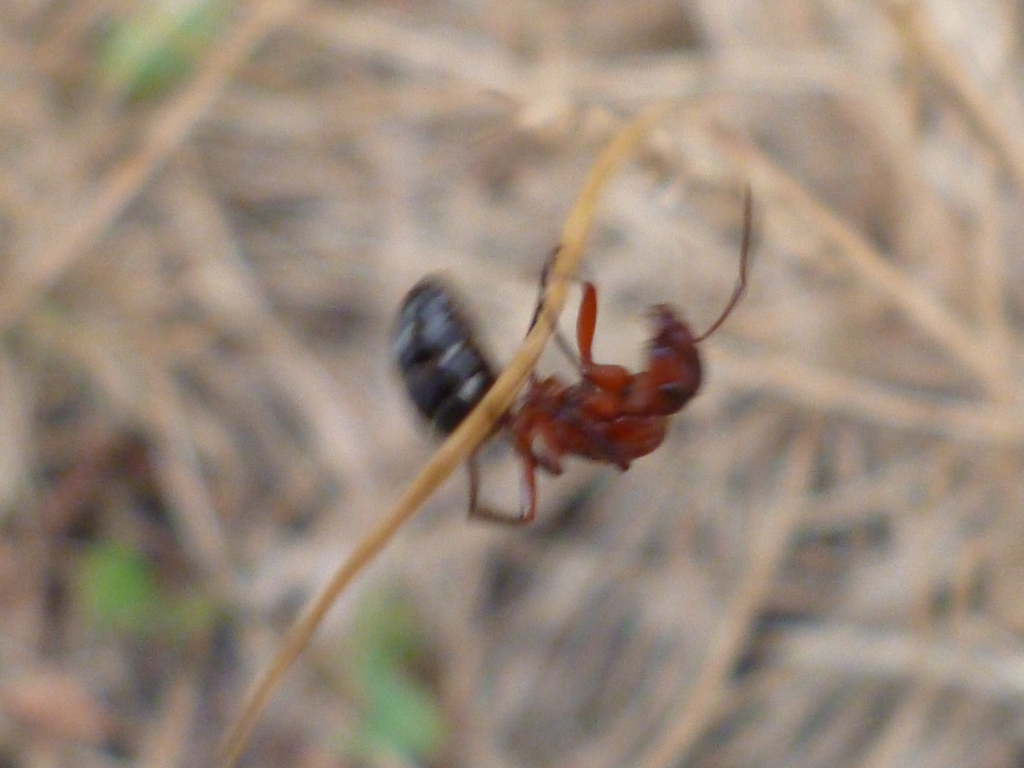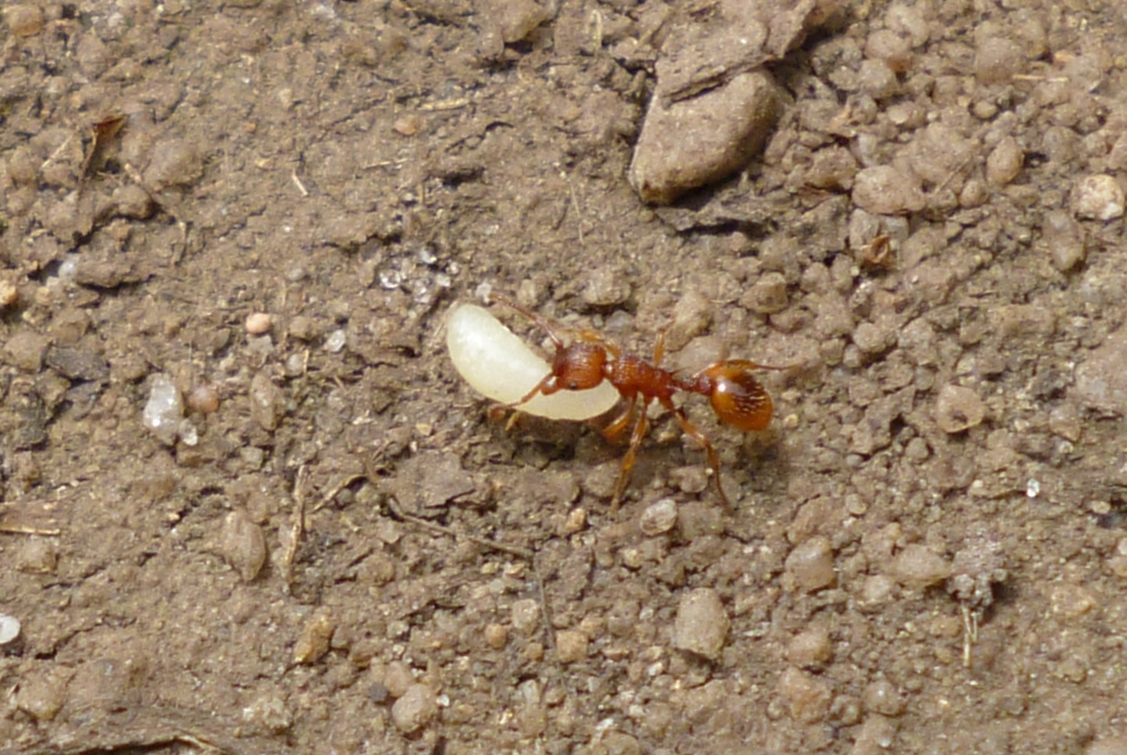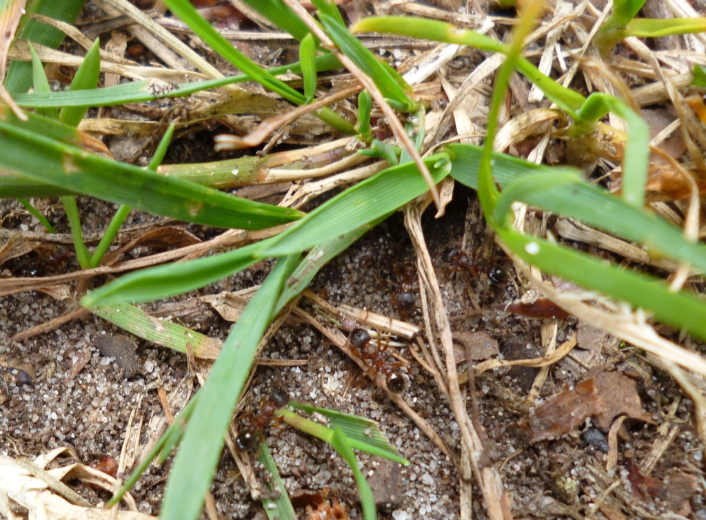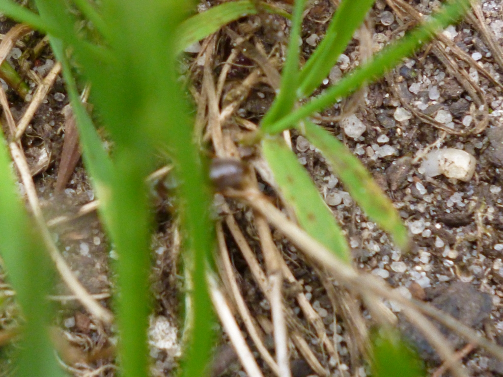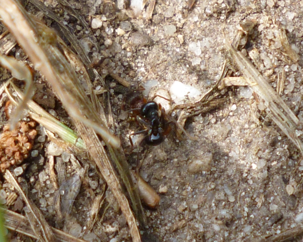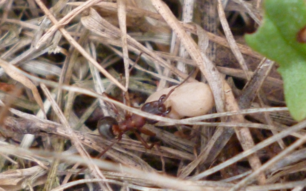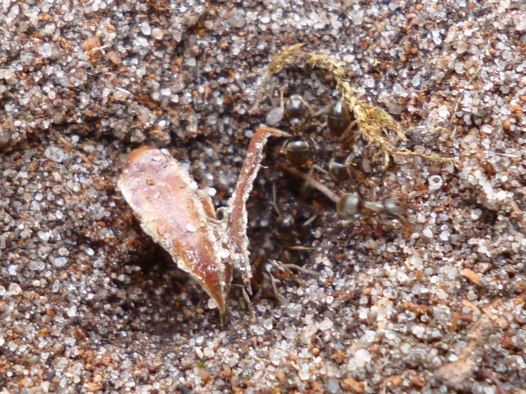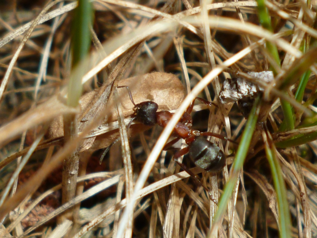 Die Myrmica sp. trugen unaufgeregt verschiedene Brutstadien in Richtung Nesthügel und wurden dabei immer wieder von Lasius fuliginosus attackiert. Die angegriffenen verhielten sich passiv und ließen die Aggressionen über sich ergehen, nur um danach unbehelligt und scheinbar unbeeinträchtigt, ihren Weg zu gehen. So richtig schlau wurde ich nicht aus dem Schauspiel, welches sich vor meinen Augen abspielte. Interessant wäre es zu wissen, woher die Brut stammte, die transportiert wurde. Immerhin handelte es sich um Nacktpuppen, was auf Myrmica sp. hindeutete. Aber auch Serviformica und Raptiformica bilden immer wieder Nacktpuppen aus, so dass auch diese Arten in Frage kommen.