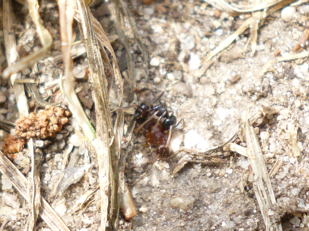 über den Weg.Wenige Meter später nahm ich einen vertrauten Geruch wahr: Es roch nach Lasius fuliginosus, bzw. deren Mandibeldrüsensekret. Der Geruch war sehr intensiv und als ich zu meinen Füßen sah, entdeckte ich ein großes Gewimmel. Bei genauerem Hinsehen war eine Auseinandersetzung zwischen Lasius fuliginosus und Myrmica sp. zu erkennen.