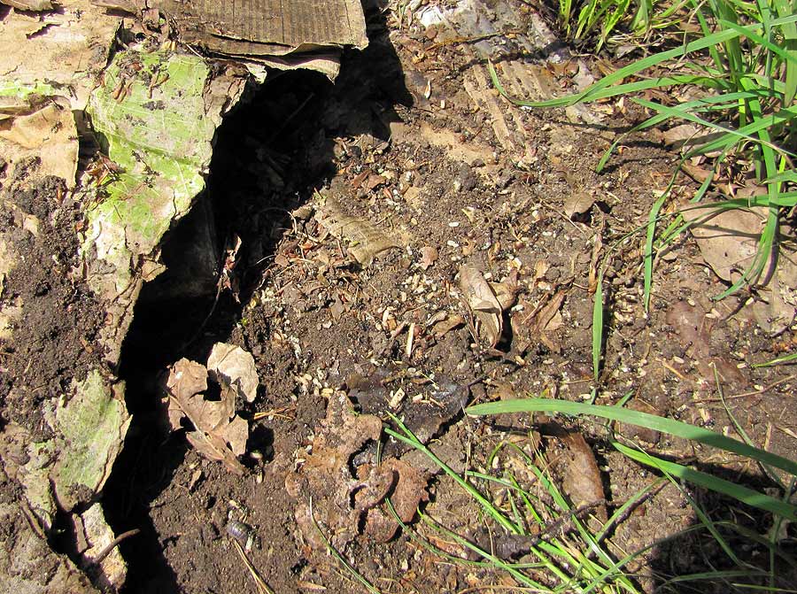 Aber natürlich, beim Spähen auf den Boden sieht man auch Ameisen! Gleich am Waldrand, wo traditionell in landwirtschaftlich genutzten Gebieten so allerhand nicht mehr ganz Brauchbares landet, stießen wir auf zwei Nester von Formica fusca.