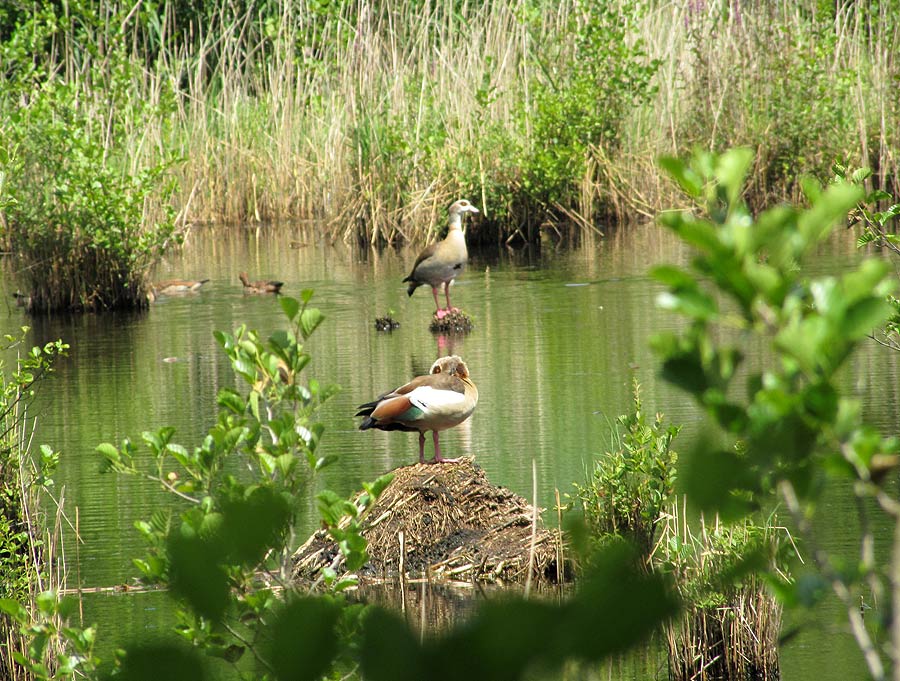 An den Tongruben flogen zahlreiche Großlibellen, im Flug natürlich nicht sicher bestimmbar. Im Wasser suhlten sich Grünfrösche (Pelophylax „esculentus“) Das Ganze ist Naturschutzgebiet und damit leider kaum zugänglich. Nur die eingeschleppte Nilgans hat, wie an ihren glitschigen Exkrementen am Ufer rasch zu erkennen, auch hier Eingang gefunden. Und tatsächlich fiel ein Paar mit rauschendem Flügelschlag auf dem größeren der Teiche ein. Den Abschluss bildete natürlich dann die Hüpfburg mit Rutsche und so weiter, sowie ein Imbiss im angenehm schattigen Biergarten.