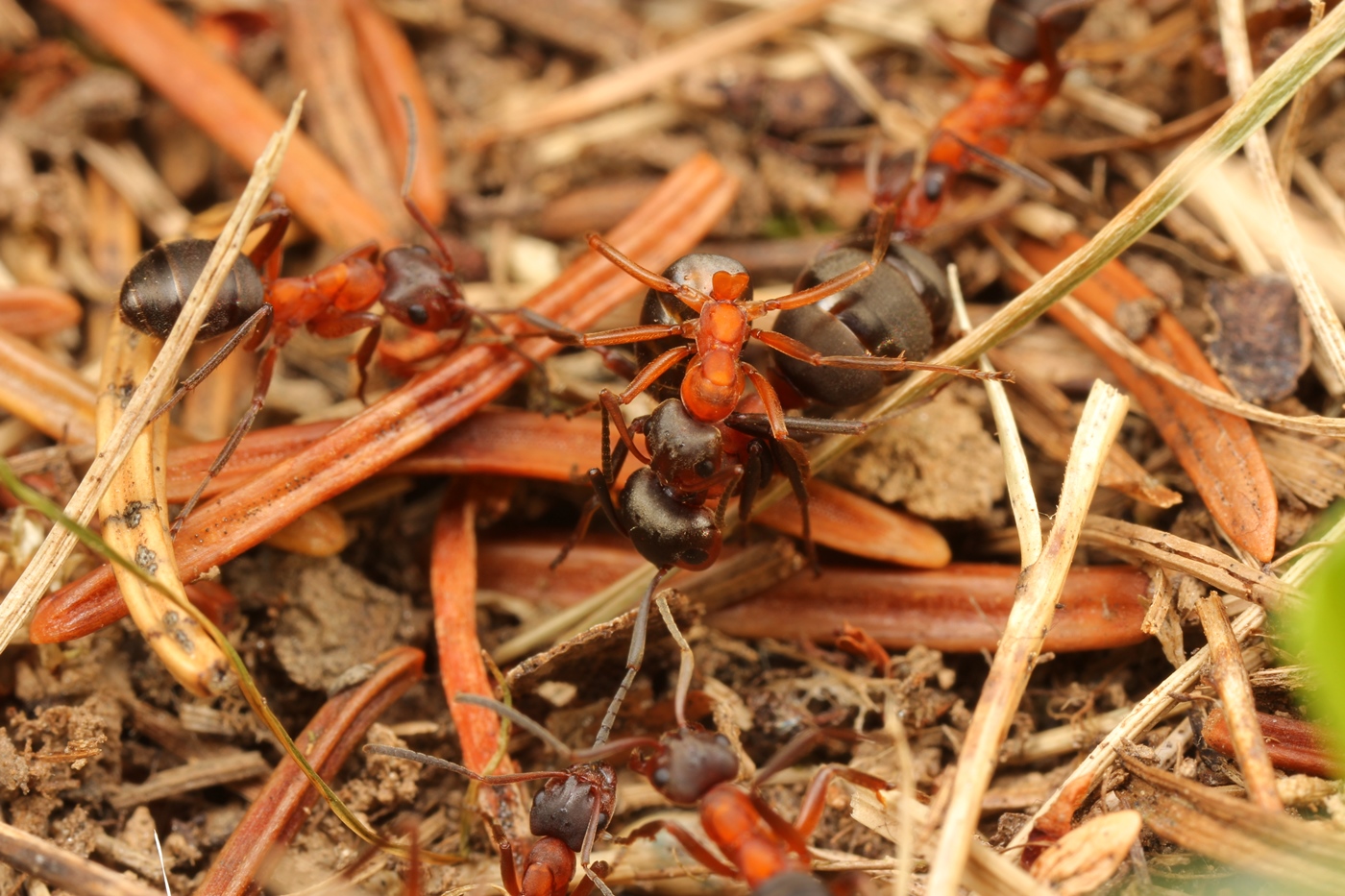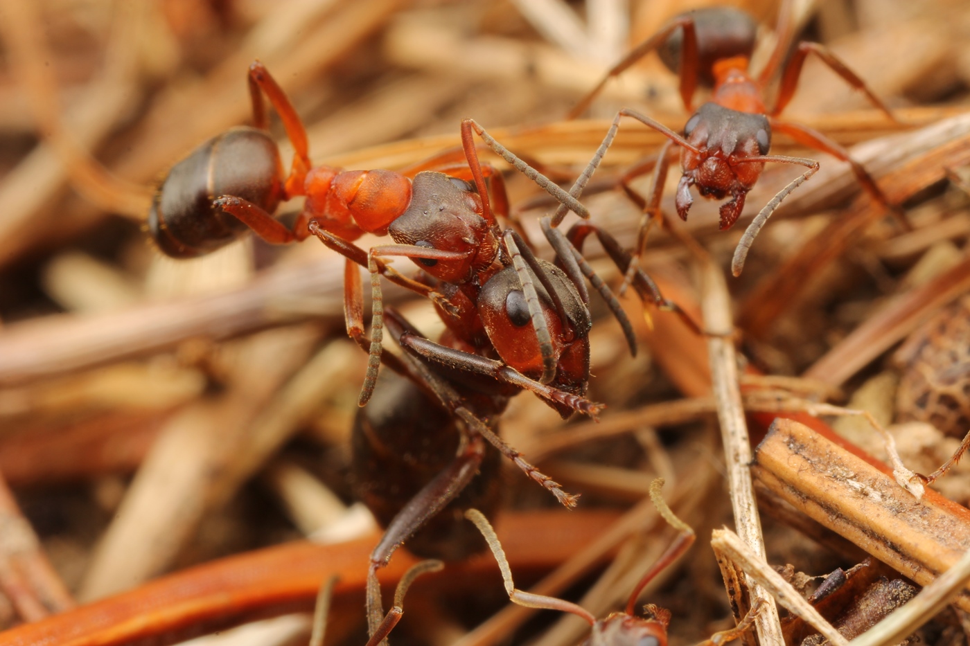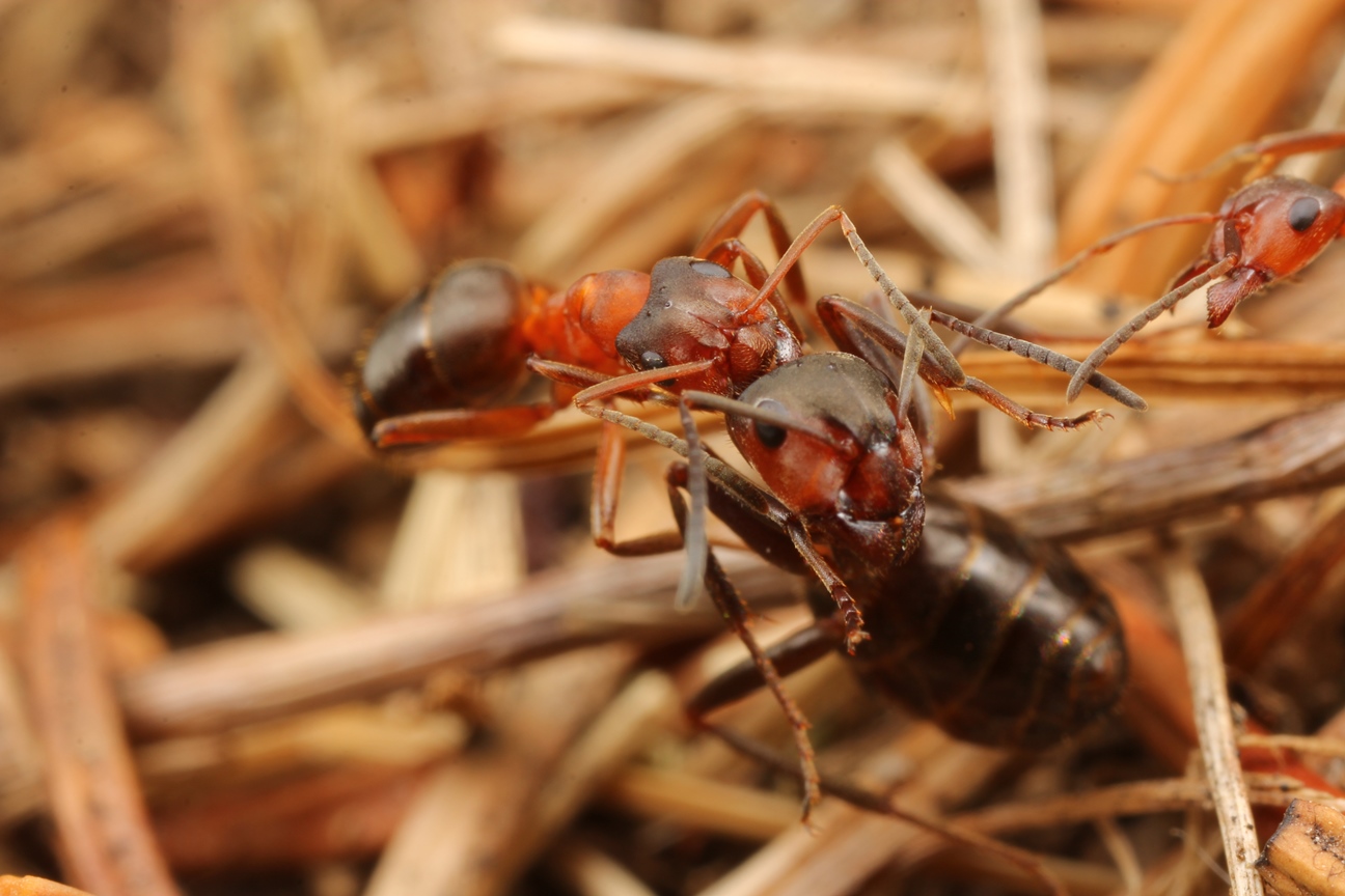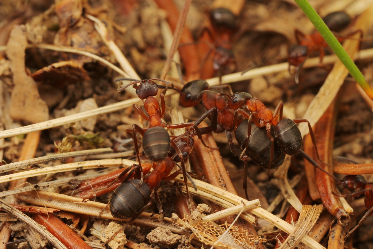 B. SEIFERT schreibt auf S. 324 zu F. exsecta: "Kampfverhalten: Sehr aggressiv und territorial. Beißen sehr schmerzhaft und kräftig zu. Vielleicht deshalb und wegen geringerer Ausbeute weniger als Waldameisen vom Braunbären (Ursus arctos) als Nahrung genutzt. Beim Kampf mit größeren Ameisen: Strecken durch mehrere Arbeiterinnen, eine Arbeiterin steigt dann auf Rücken und beißt Kopf ab."