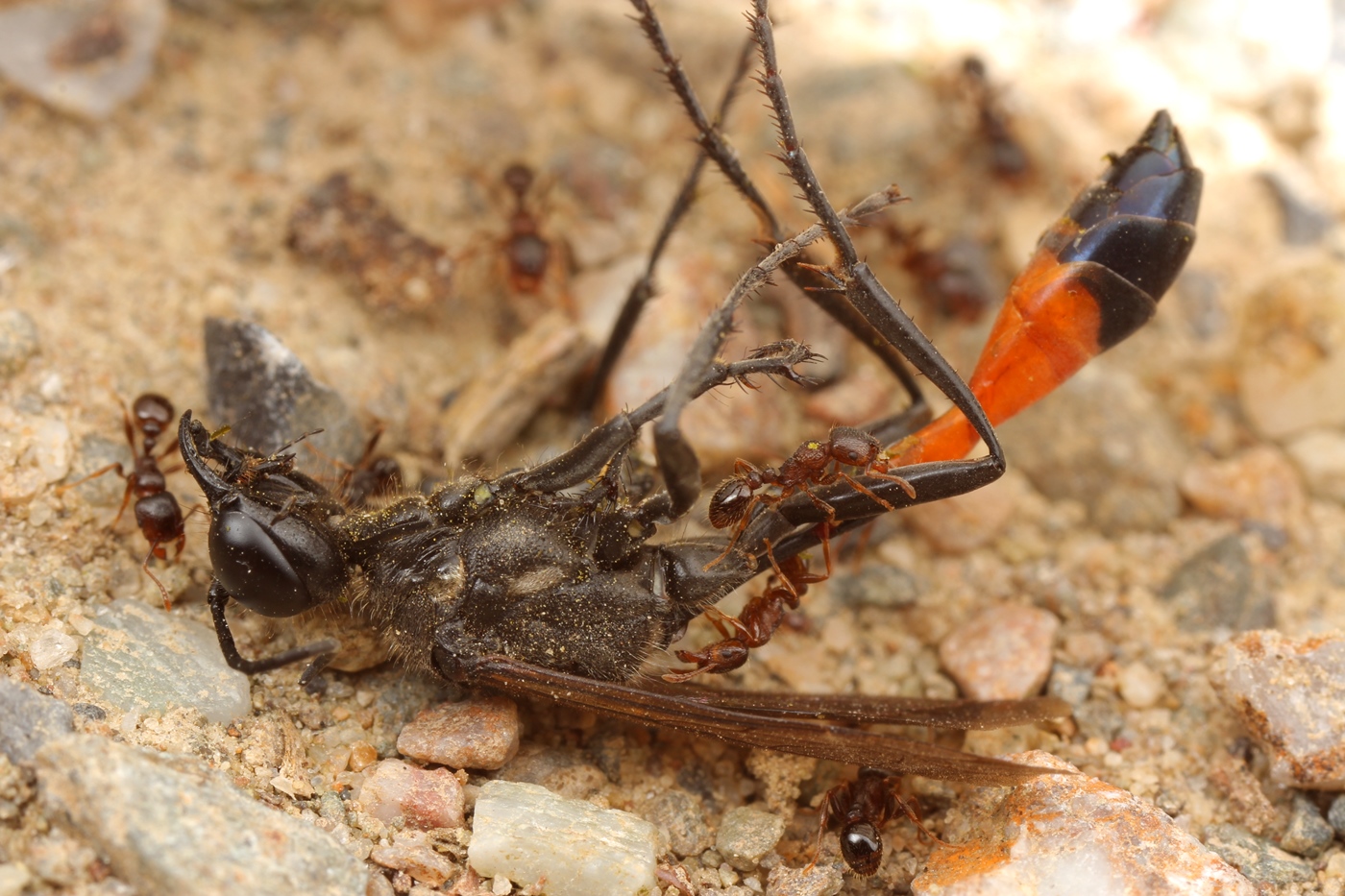 Anlässlich der kriegerischen Auseinandersetzung zwischen Camponotus vagus und Formica sanguinea (Bericht v. 30.8.) eilte ich zum Ort des Geschehens, und da kann es passiert sein: Eine solitäre, parasitische Wespe schleppte vermutlich gerade eine von ihr paralysierte Raupe Richtung Nesteingang - und da bin ich vielleicht draufgetreten. Oder es war doch der inzwischen durchmarschierte Reiter mit seinem Pferd........ jedenfalls schade. Opfer und Räuber lagen unmittelbar nebeneinander.