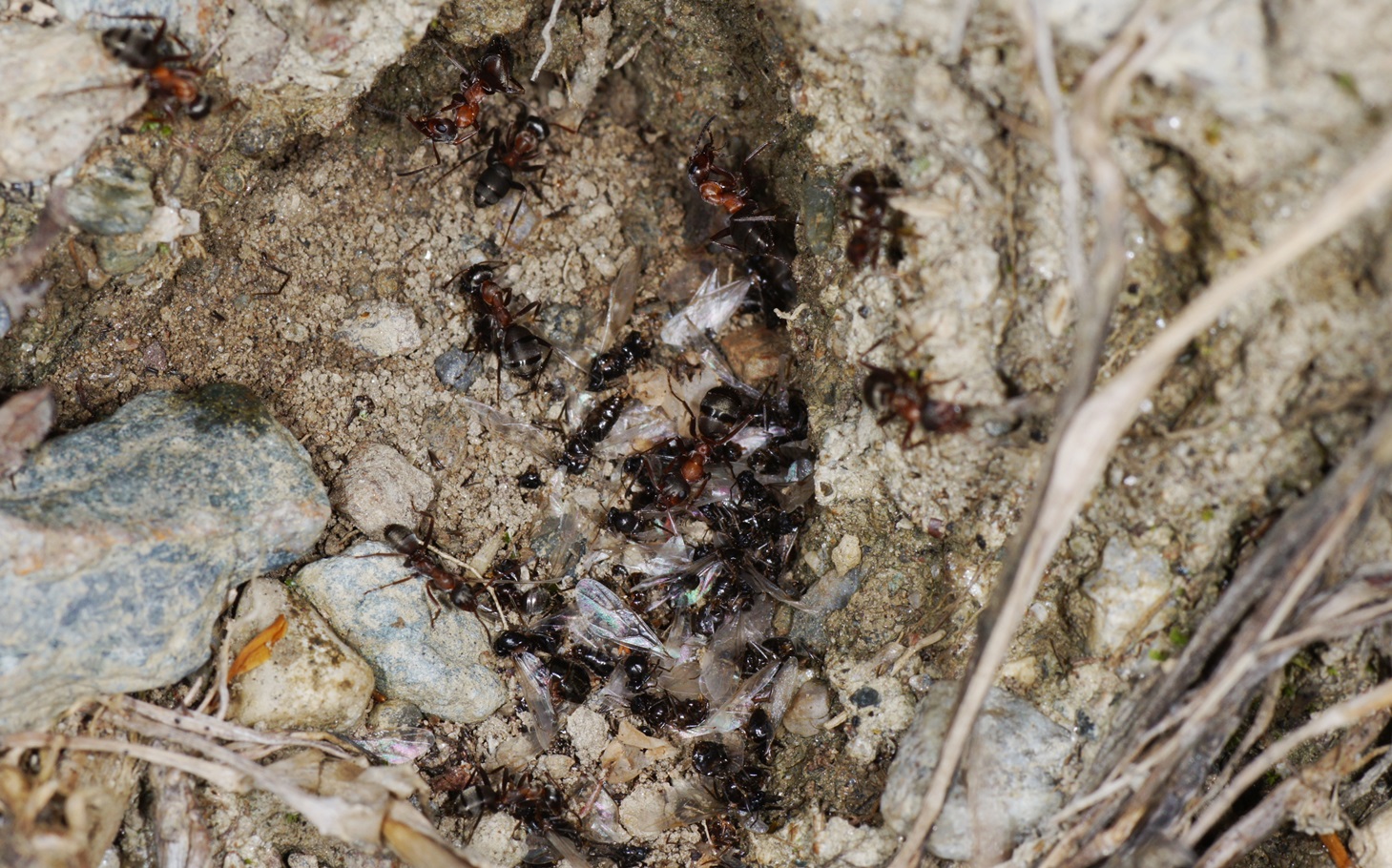 Gestern machte ich eine ungewöhnliche Entdeckung: 18:30, Nest von Formica rufibarbis an einem Ackerrand. Ich bemerkte sofort, dass hier etwas nicht stimmt: Die Ameisen wirkten aufgeregt, in den Nesteingängen hielten sich gleichzeitig auffallend viele Individuen auf. Direkt neben dem Eingang lagen gehäuft schwärzliche Insektenteile herum, dazwischen Flügel, einige rufibarbis-Arbeiterinnen stocherten darin herum. Was ist los? Bevor ich meine Kamera schussbereit hatte, sah ich ein dunkles, alates Insekt aus dem Eingang des rufibarbis-Nestes laufen! Es wurde sofort für die Bestimmung eingefangen; vom Habitus her gesehen hätte ich gesagt Lasius sp., wohl Chthonolasius sp. Die kommen aus dem Nest der Serviformica?