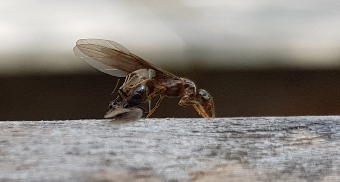 Bemerkenswert erscheint, dass beide Arten vollkommen synchron geschwärmt haben; in dieser Vollkommenheit hatte ich das in den letzten Jahren nicht beobachtet. Gut, die beiden Arten sind nahe verwandt, wurden früher trotz vollkommen unterschiedlicher Färbung oft verwechselt. Beide gehören der Untergattung Myrmentoma an, vertragen sich aber überhaupt nicht: https://www.google.at/search?q=Aggressi ... 8QeH0JLoAg