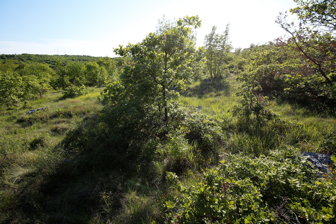 Alle Jahre wieder gibt es den Familienausflug nach Istrien (29. 04 - 01. 05.). Für Boro und Sohn Roman eine ideale Gelegenheit sich abzusondern und im Binnenland Naturräume zu erkunden. Davon gibt es hier genug: Der Karst war immer dünn besiedelt und leidet zudem seit Jahrzehnten unter der Abwanderung. Einsame Häuser, wenig besiedelte Dörfer, vernachlässigte Wein- und Olivenkulturen, wenig Ackerbau. Auch von der früheren Schafzucht sieht man fast nichts mehr. Dafür kilometerweit Natur pur, Trockenrasen, Magerwiesen, lichte Busch-Wälder, vorwiegend aus Flaumeiche (Quercus pubescens), Mannaesche (Fraxinus ornus) und Hopfenbuche (Ostrya carpinifolium) bestehend. Oft dürfte es sich auch um Sekundärwald handeln, denn vor der flächenhaften Rodung durch die Venetianer sah es sicher anders aus. Sehr verstreute Forste mit Schwarzkiefer (Pinus nigra) sind sicher Folgen der Aufforstungsprojekte der vergangenen Jahrzehnte.