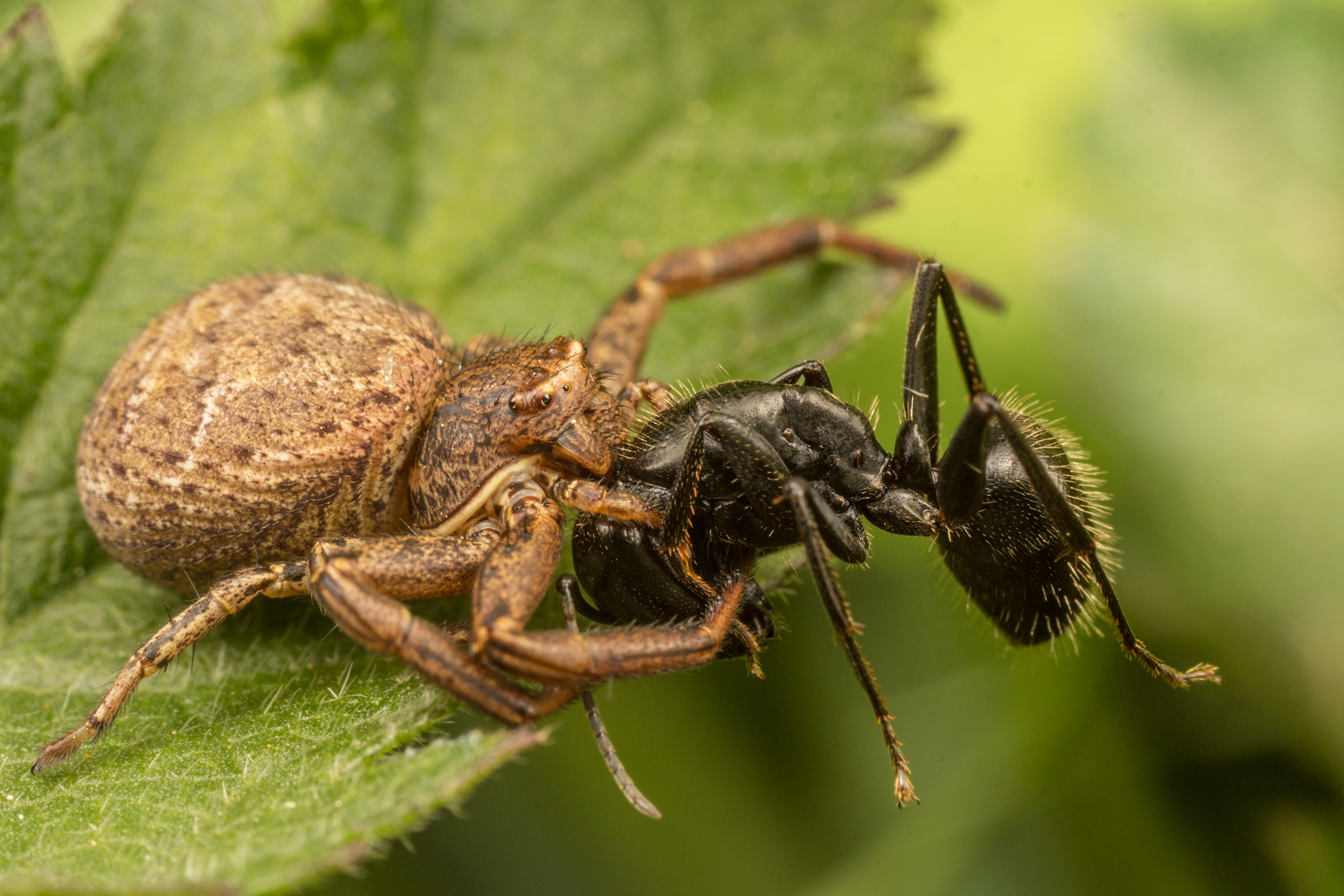 Krabbenspinne mit bekanntem Opfer: Camponotus vagus, diese mediterrane Ameise kommt in Istrien nur sehr verstreut und selten vor