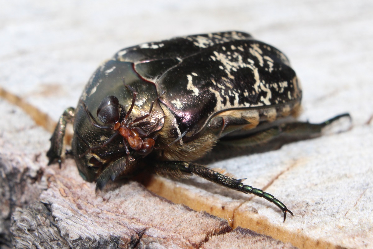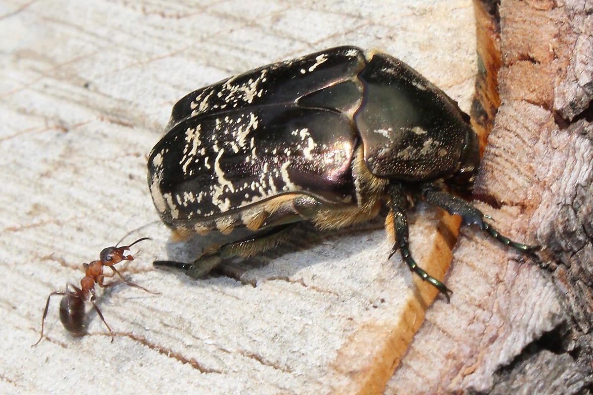 Bronzegrüne Rosenkäfer (Protaetia lugubris) sucht Pflanzensaft zwischen Holz und Rinde einer im Herbst des Vorjahres gefällten Eiche.