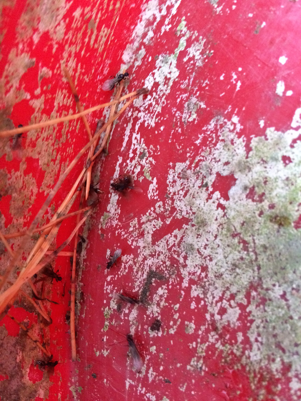 Heute habe ich eine seltsame Beobachtung machen können: In einem leeren, roten Wassereimer aus Kunststoff, tummelten sich zwischen 50 und 80 Geschlechtstiere einer Knotenameisenart (vermutlich Myrmica), die schwarzen Männchen waren deutlich in der Überzahl, gegenüber den alaten, ca. 8. mm langen, roten Gynen. Keine einziege Arbeiterin war zu sehen. Dafür waren vereinzelt kopulierende Pärchen auszumachen. Es schien, als nützten die Ameisen das Becken als "Treffpunkt" nach dem Schwarmflug.