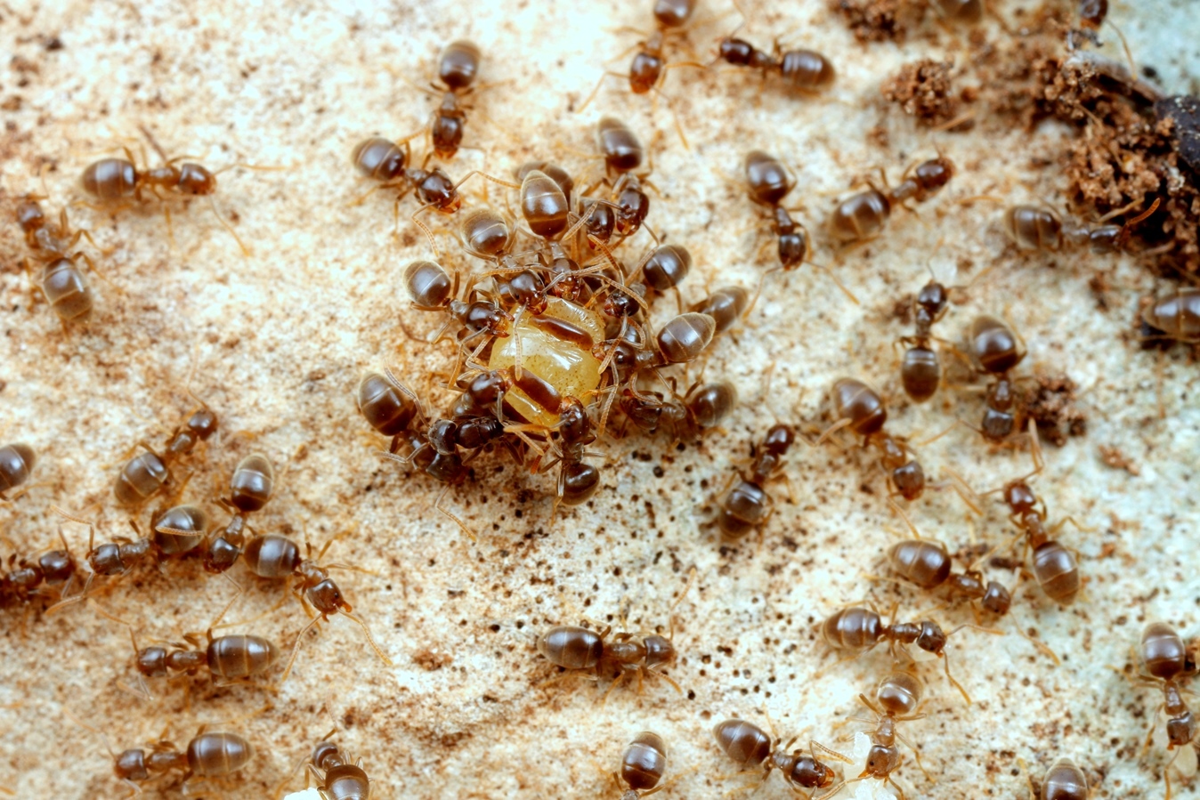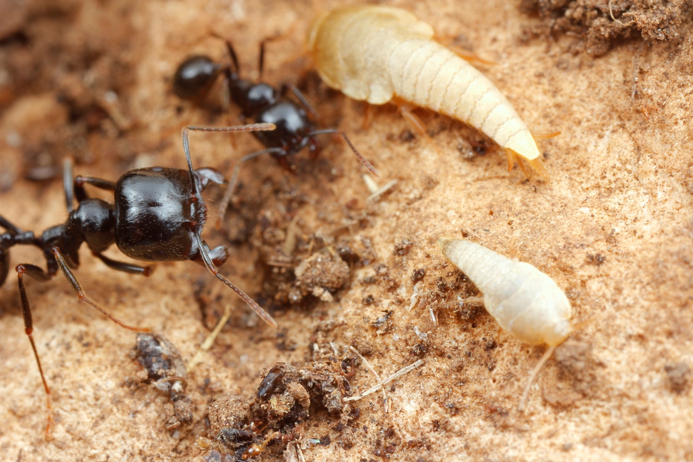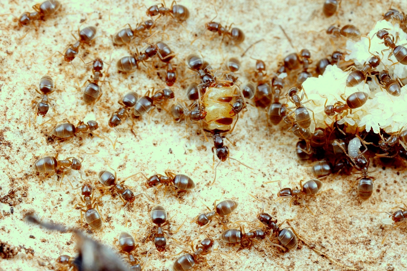 Messor capitatus mit myrmecophilen Ameisenfischchen Atelura formicaria; diese Nestbewohner leben vom Abfall der Ameisen
