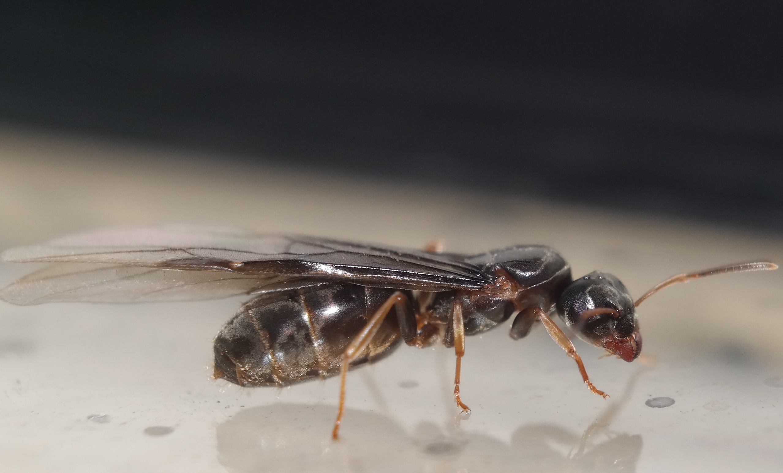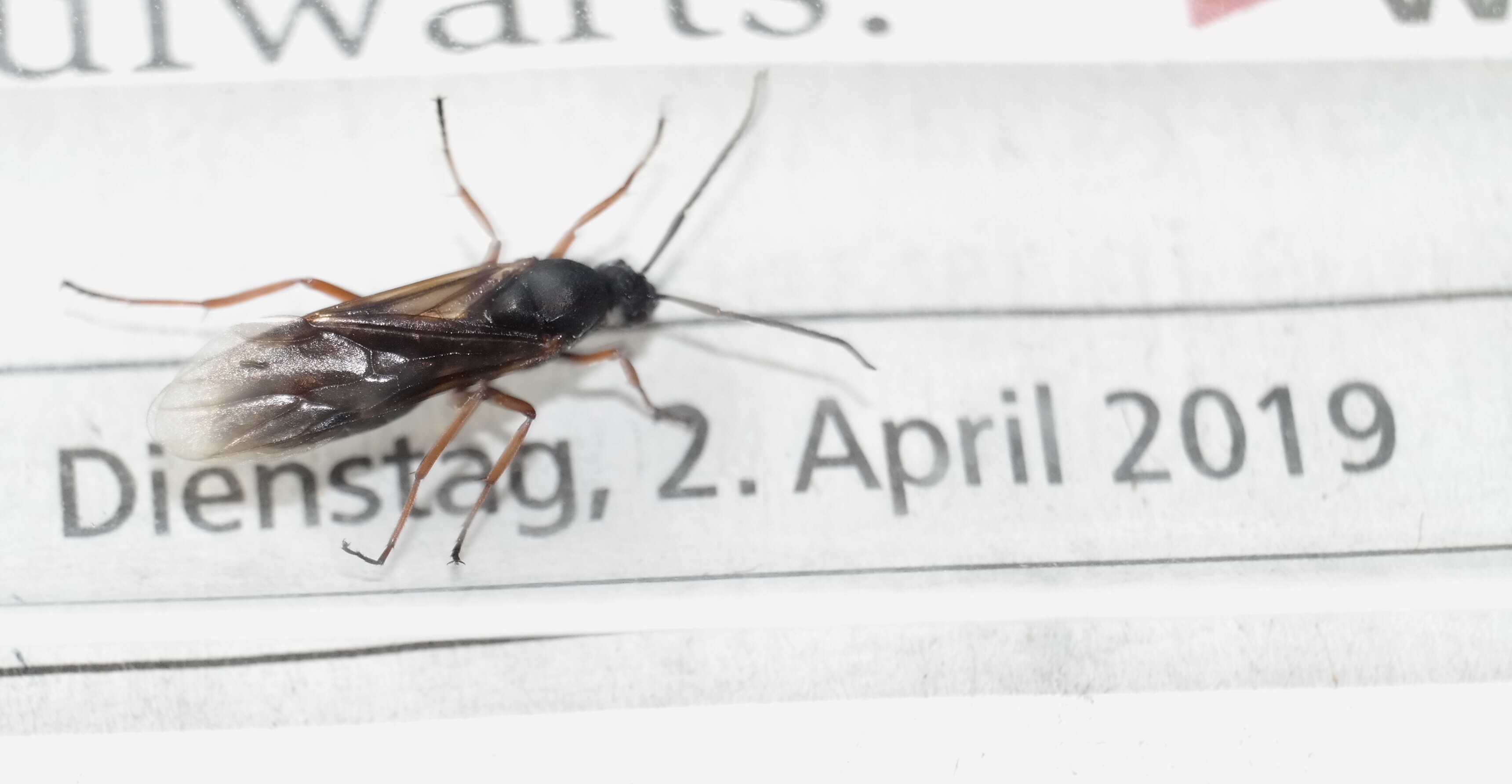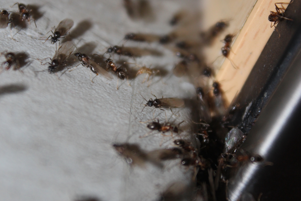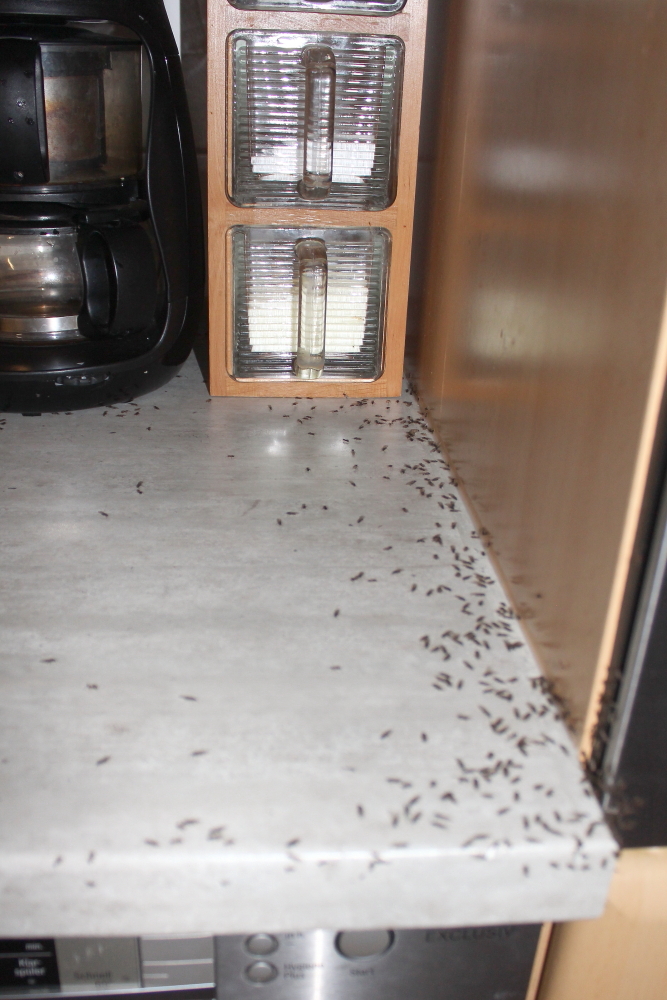Aber dieses Mal blieb die Zuckerschütte unbeachtet! Der Nest-Ausgang wurde Richtung Küche aus einem anderen Grund verfehlt: Schwärmzeit abends 3 Tage lang bis zum 01.06.2019 bei Lasius emarginatus. Also Fenster öffnen!