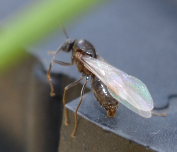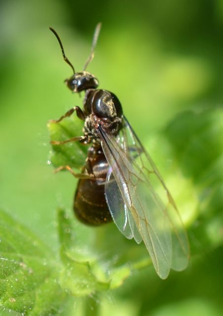 Nach langer Verzögerung durch mieses Wetter, war es heute endlich so weit! Ich habe 3 Nester der seltenen C. piceus im Garten, das erste wurde mit dem Fund einer dealaten Gyne aus der Region vor über 10 Jahren im Terrarium gegründet und anschließend bei mir im Steingarten freigesetzt. Nach 2 Jahren waren plötzlich in einem Nest 2 Gynen, die haben sich jeweils mit Arbeiterinnen getrennt und damit waren es 2 Nester (offenbar kann es eine Gründung in Pleometrose geben, wo das 2. Weibchen herkam, weiß ich nicht). Voriges Jahr hat es eine weitere Trennung gegeben, jetzt habe ich 3 Nester. Beim Hauptnest konnte ich heute nur Männchen entdecken, beim ersten "Ableger" nur ein paar Männchen und gerade beim letzten "Ausreißer" waren wenige Männchen und 2 Weibchen zu entdecken. Wenn nur Männchen erscheinen, ist das kein gutes Omen: Es könnten z. B. Arbeiterinnen Eier legen und die Königin fehlen. Der Konkurrenzdruck ist hier hoch, die Futtersituation daher prekär. Vor allem Lasius niger und L. emarginatus sind sehr gefährliche Gegner!