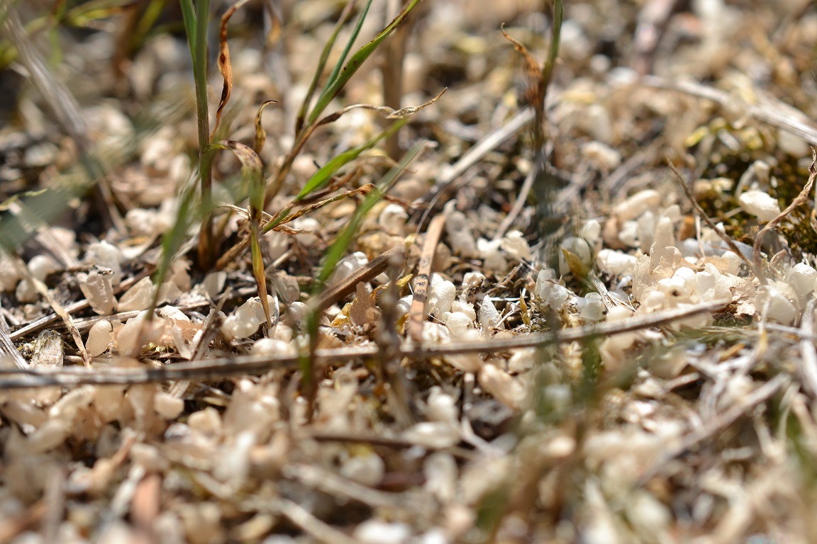 Bemerkung: Mir ist heute aufgefallen, dass alle Nester die heute auch schwärmen, riesige Mengen leerer Puppenhüllen um die Eingänge verteilt haben (->Foto). Aus einem Nest schwärmten nur Männchen.