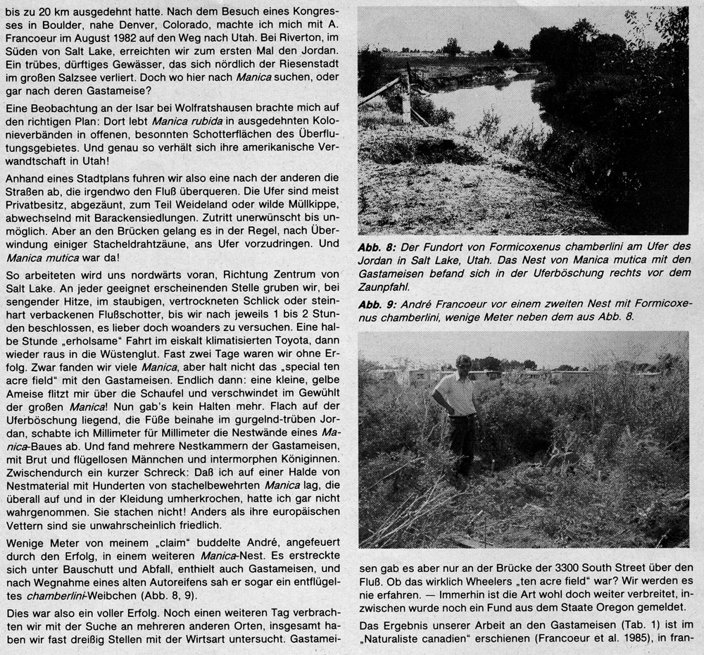 Dieser Tage erreichte mich eine E-Mail von einem Myrmekologen aus Salt Lake City, Utah: Dort hatte ich 1982 mit einem kanadischen Kollegen zusammen eine Gastameise (Formicoxenus chamberlini, früher Symmyrmica chamberlini) gesammelt. Sie lebt bei Manica mutica, dem amerikanischen Pendant zu unserer Manica rubida, war 1904 von „den river plains des Jordan-Flusses“ beschrieben, „nahe Salt Lake City“, aber nur „in einem bestimmten ten acre field“ (einer Fläche von ca. 40.000 qm), während die Wirtsart mancherorts häufig sein sollte. Jeder Hinweis auf die Lage dieses besonderen Feldes fehlte, und bis zu unserer Suche war die Gastameise dort nicht mehr gefunden worden. Zum Glück hatten wir unsere Fundorte sehr genau beschrieben, so dass der Kollege diese ohne Probleme identifizieren konnte. Aber: Weder Manica mutica noch natürlich deren Gastameise konnte er entdecken.
