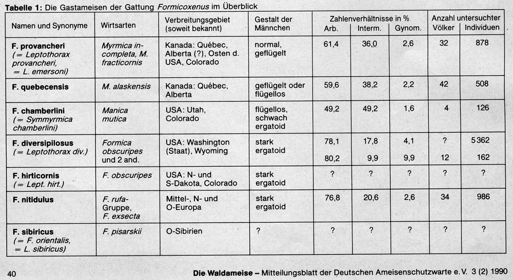 Von derselben Seite unten: Übersicht der Gastameisenarten.