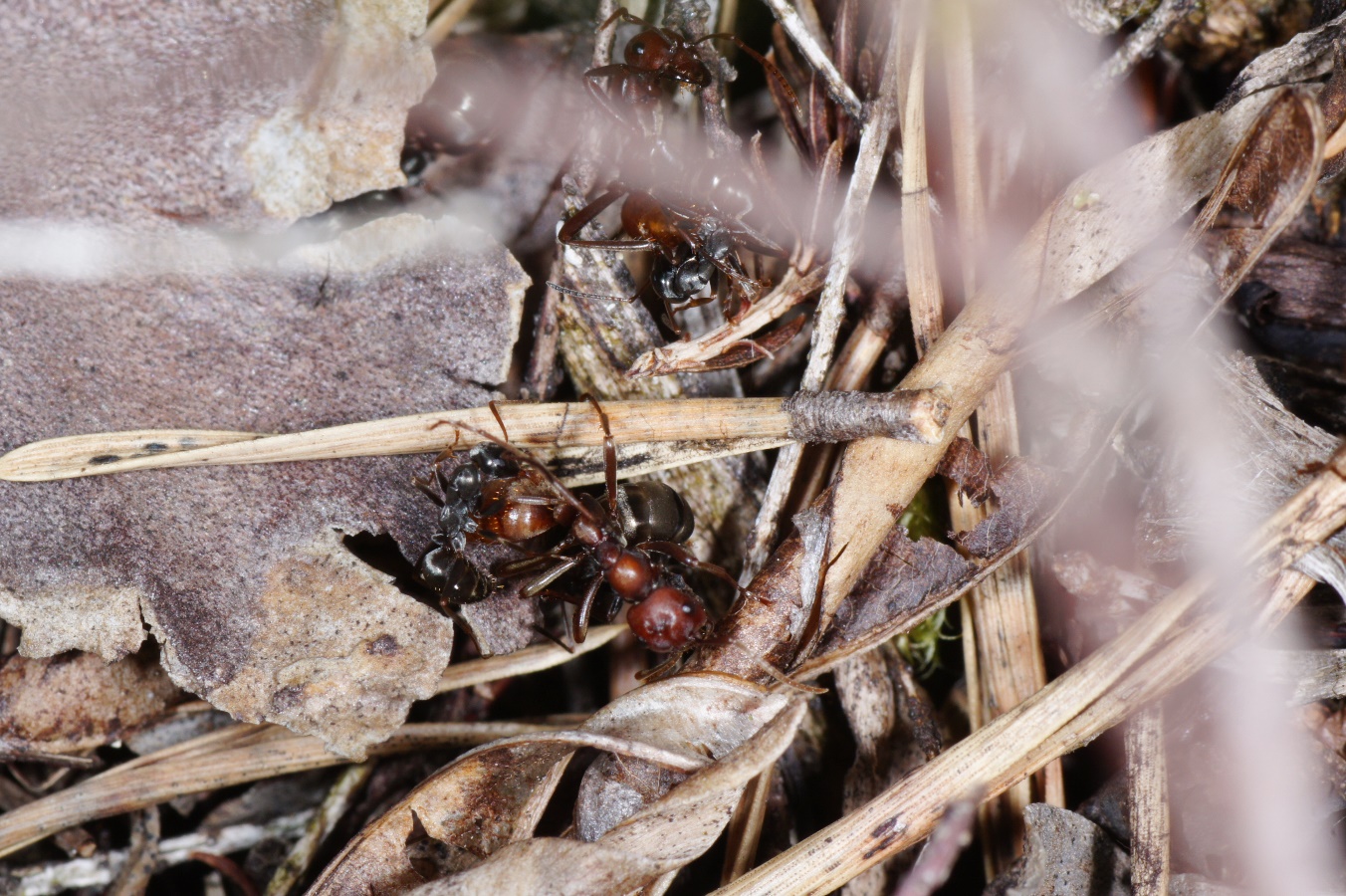 Auch bei der subdominanten Formica fusca beginnen sich die Verteidiger schließlich zu wehren. Kein Vergleich mit großen F. rufibarbis-Nestern, da kann es zu regelrechten Abwehrschlachten kommen.