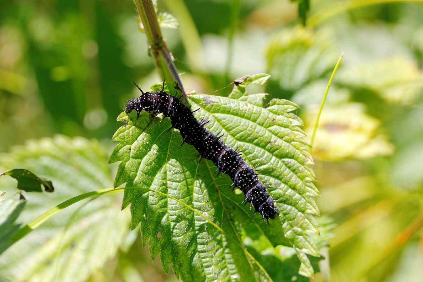 Raupe des Tagpfauenauges auf Brennessel