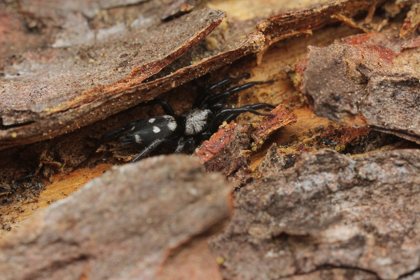 Zwei bemerkenswerte und nicht erwartete Arthropoden möchte ich vorweg herausgreifen: Der Schwarze Apollo wurde mehrfach gesehen, zum Fototermin hat er sich leider nicht eingestellt. Und: Ich konnte eine myrmecophage Spinne, die uns sehr gut bekannte Callilepis sp. finden. Bei uns gibt es Callilepis nocturna und die Zwillingsart C. schuszteri, beide nicht gerade oft anzutreffen. Ich dachte sofort: Eine Callilepis ohne Vorkommen von Camponotus vagus?; beide Arten hätte ich hier in einer Rodungsinsel nie erwartet. Schon 2012 hatte ich herausgefunden, dass es zumindest in Kärnten eine enge Räuber-Beute-Beziehung zwischen beiden Arten gibt [Borovsky V. (2012): Beobachtungen zur Räuber-Beute-Beziehung zwischen Callilepis spp. (Araneae: Gnaphosidae) und Camponotus vagus (Hymenoptera: Formicidae) - Carintihia II 202./122.: 713-722). Was soll ich sagen: 30 Sekunden später konnten wir die ersten Majore v. vagus entdecken.