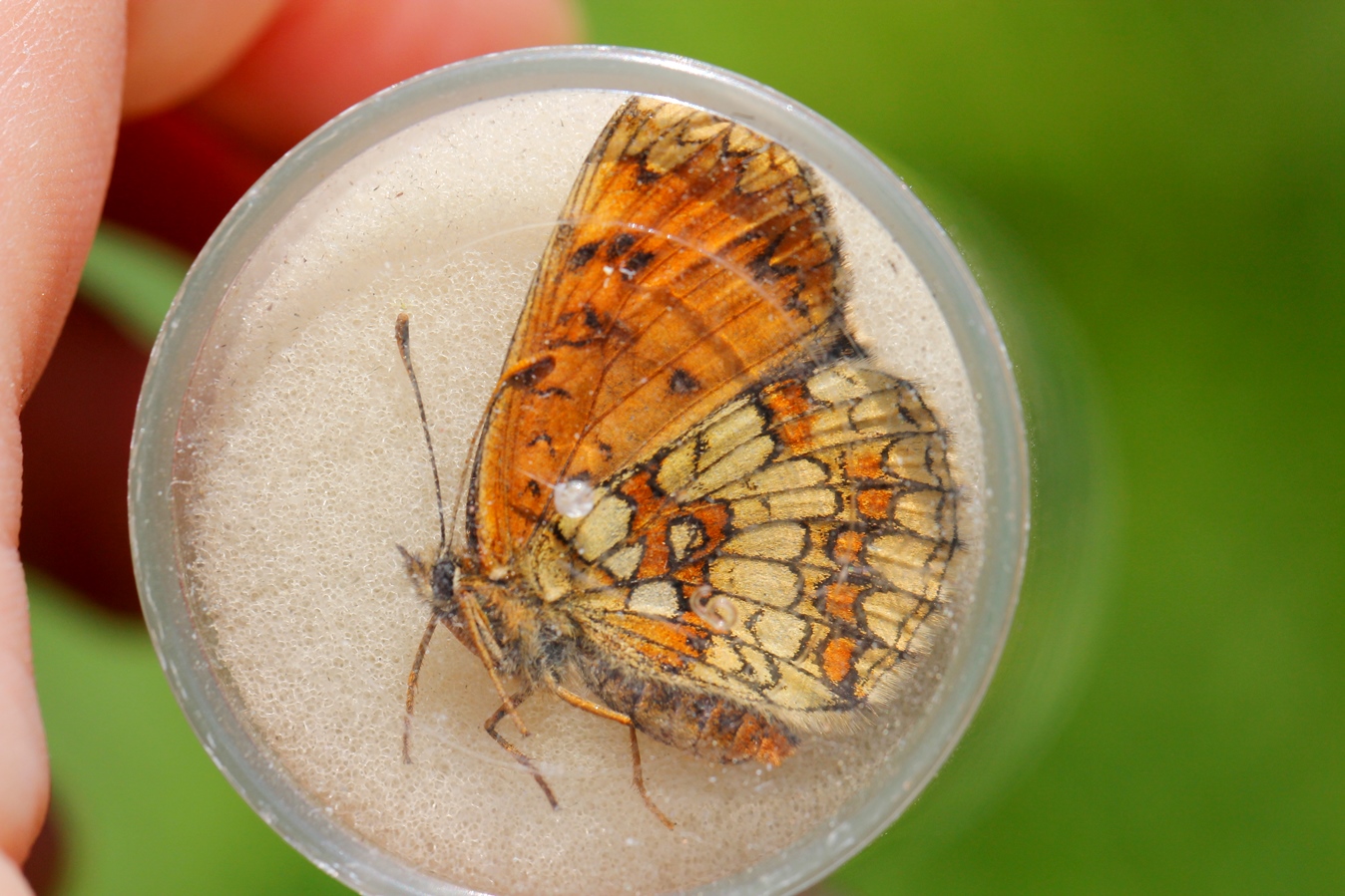 Scheckenfalter in der Bestimmungsbox; danach wieder unbeschadet freigelassen!