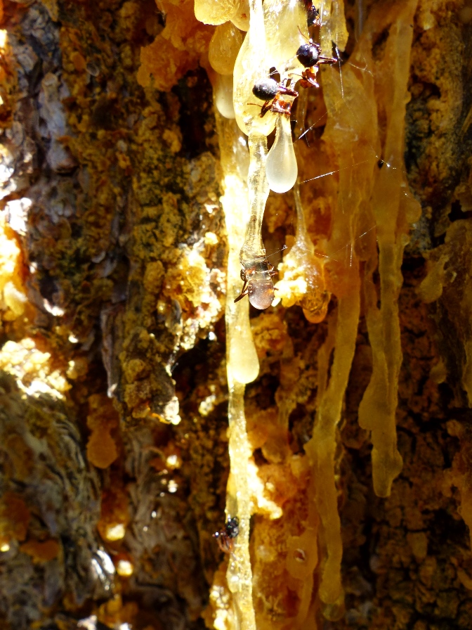 Die ersten 4 Fotos stammen vom Entdecker, die folgenden Bilder von Sohn Roman, er versuchte einige Makro-Aufnahmen zu machen: Kein schöner Tod für die Insekten: Zuerst kleben sie fest, die "unerbittliche" klebrige Masse beendet rasch alle Befreiungsversuche. Die nächsten Harztropfen begraben die Ameisen schließlich zur Gänze. Bei einer Waldameise könnte es sich um Formica pratensis handeln.