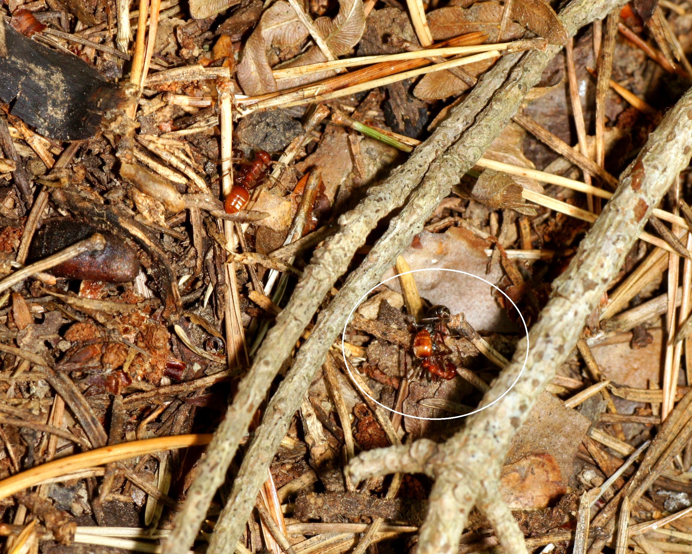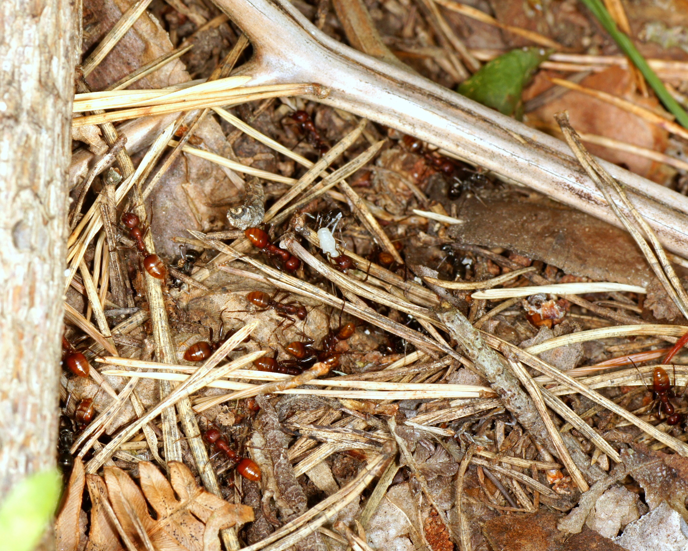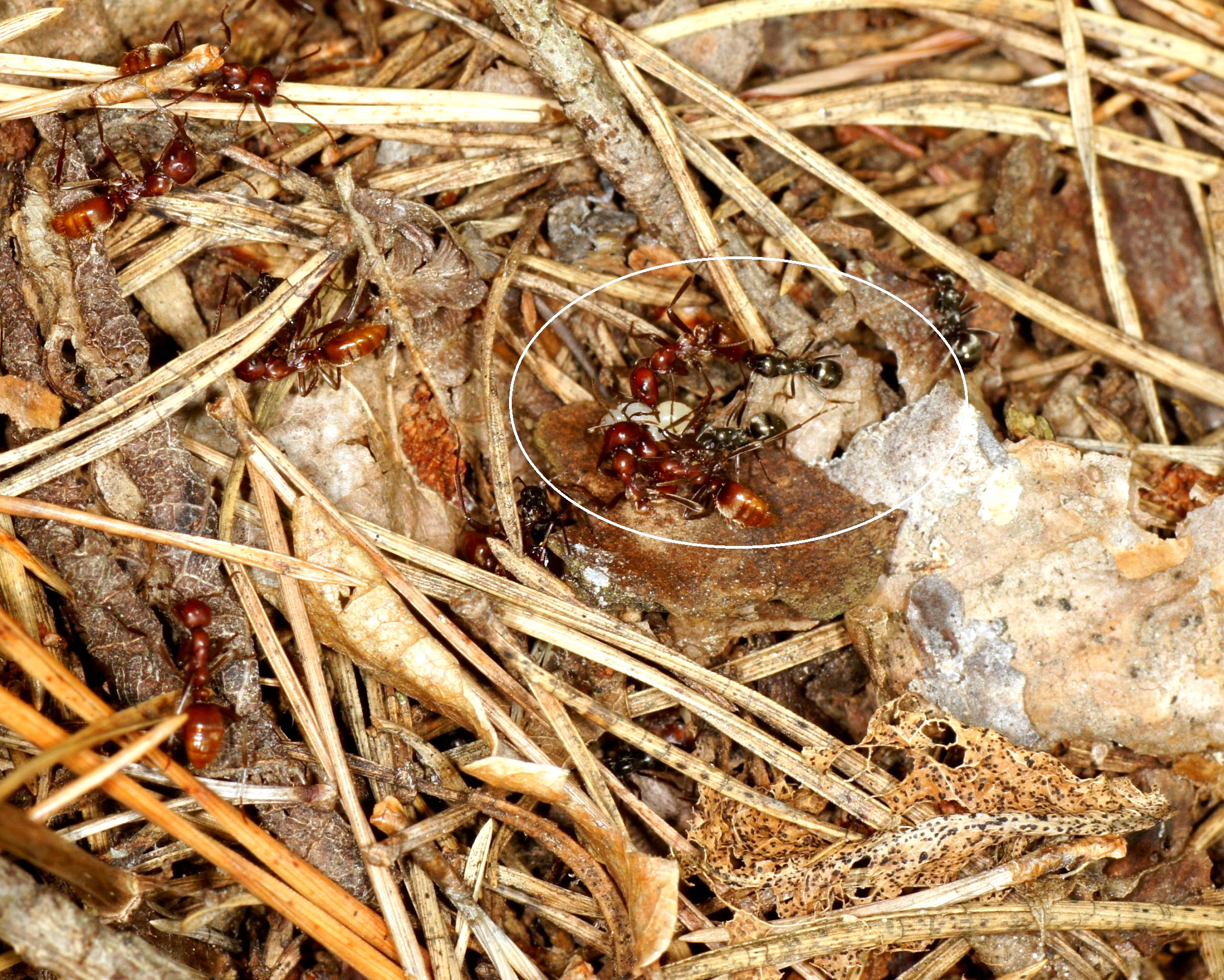 Es fiel sofort auf, dass die Marschordnung relativ ungeordnet verlief, mit einer Breite von etwa 0,50 m; normalerweise gibt es eine ziemlich geschlossene Marschordnung mit etwa 10-20 cm Breite. Die Anzahl der Räuber war überschaubar, es wurde sicher nicht das ganze Potential ausgeschöpft. Nach 7 m war plötzlich Schluss, die Spur zum Zielnest ging offenbar verloren. Erst nach 11 Minuten gelang es einigen Pfadfindern die Spur wieder aufzunehmen und dies an die inzwischen weit verbreitete Schar auf chemischem Wege mitzuteilen. Nach weiteren 2 m wurde das Zielnest (Formica fusca) erreicht. Diese Ameisenart lässt sich immer wieder überraschen, sodass die eindringenden Amazonen ihr Sekret aus der Mandibeldrüse im Nestinneren freisetzen können um die Verteidiger in Panik zu versetzen. Bei Formica rufibarbis gelingt das oft kaum, weil diese aggressiven Nestverteidiger die ersten Amazonen schon auf dem Nest „abfangen“ und sehr rasch rekrutieren; die Folgen sind dann auch Kämpfte zwischen Angreifern und Verteidigern, die zahlreiche Opfer auf beiden Seiten zur Folge haben können. Aber auch stärkere Populationen von F. fusca beginnen sich im Laufe des Überfalls zu wehren.