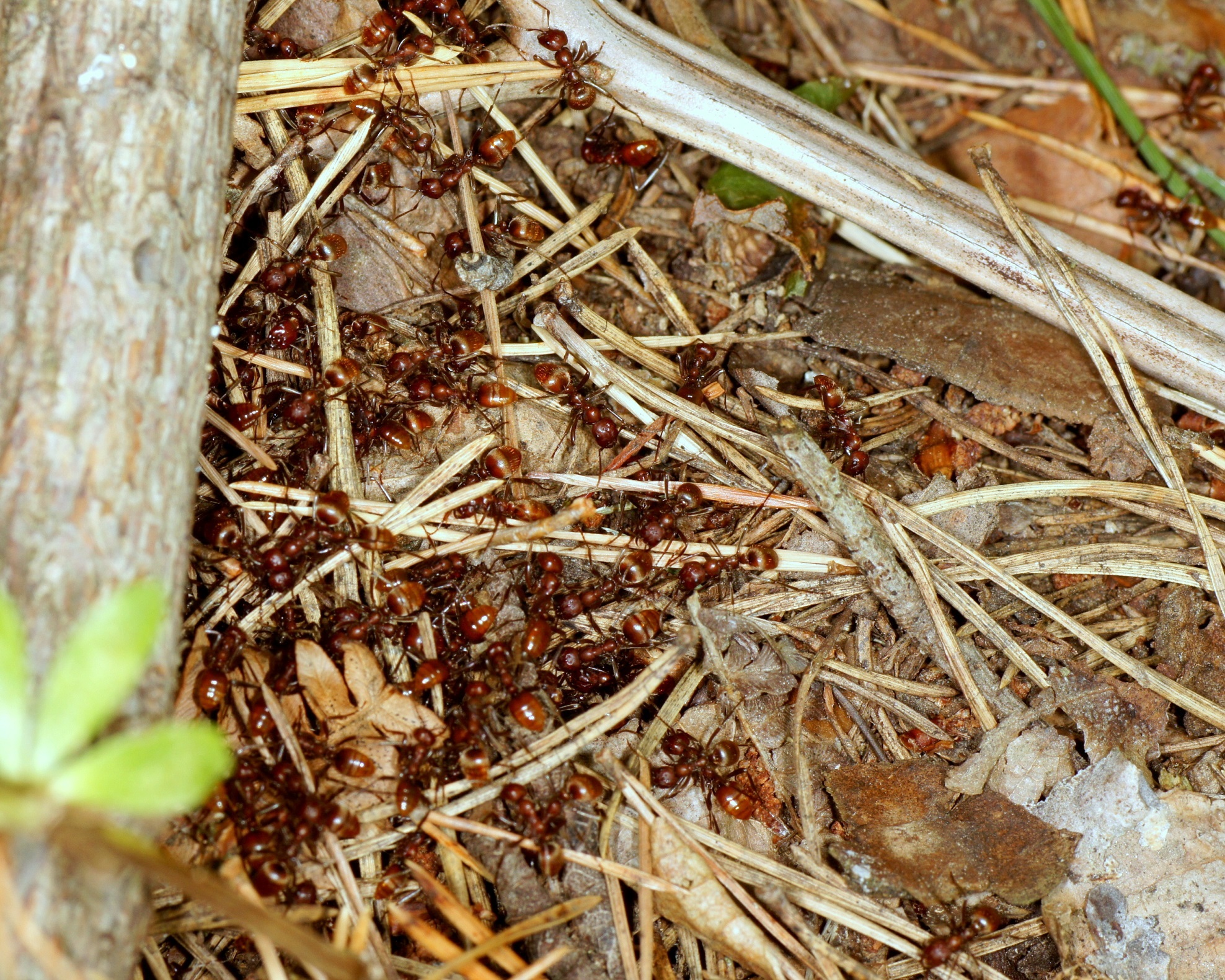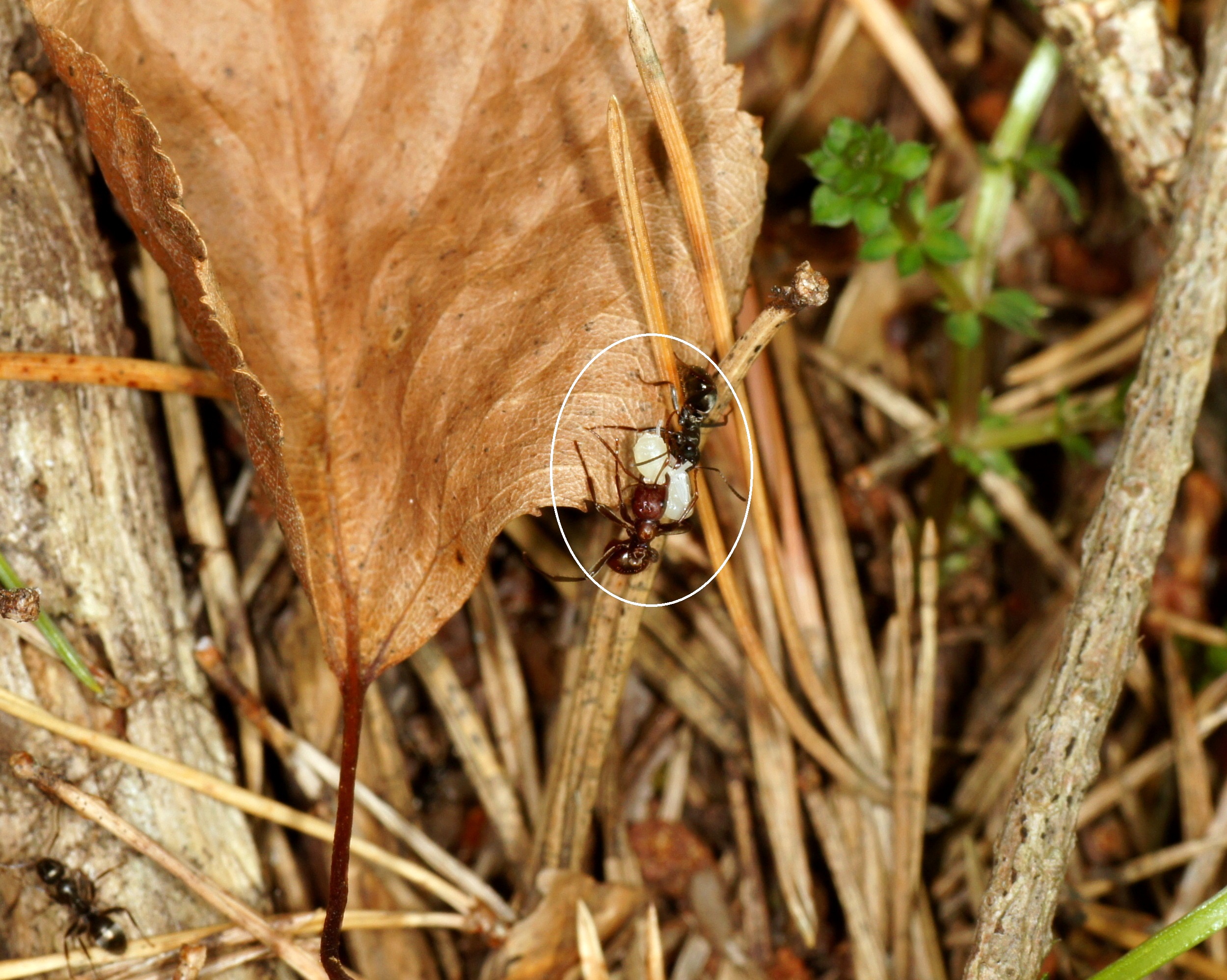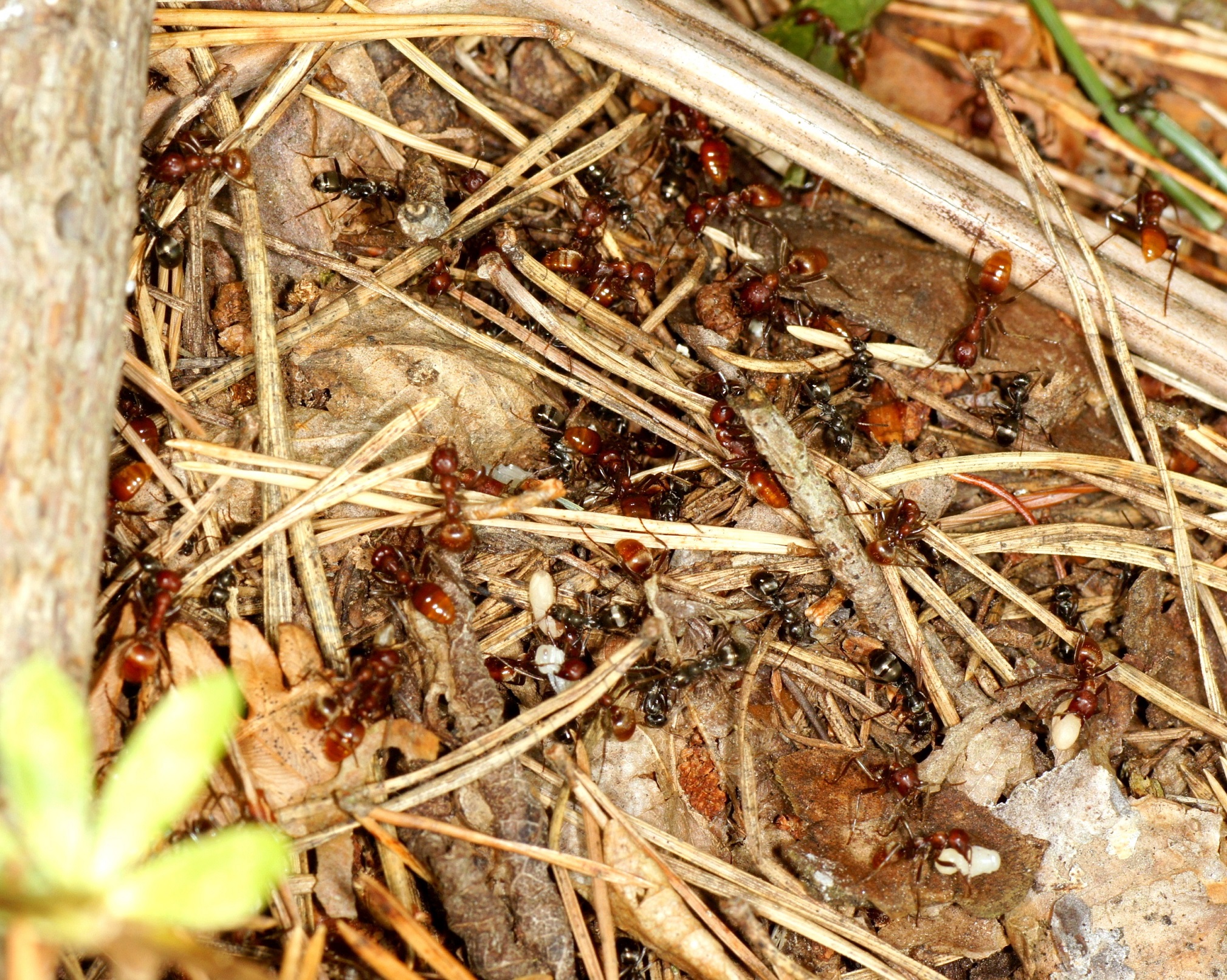 Es fiel sofort auf, dass die Marschordnung relativ ungeordnet verlief, mit einer Breite von etwa 0,50 m; normalerweise gibt es eine ziemlich geschlossene Marschordnung mit etwa 10-20 cm Breite. Die Anzahl der Räuber war überschaubar, es wurde sicher nicht das ganze Potential ausgeschöpft. Nach 7 m war plötzlich Schluss, die Spur zum Zielnest ging offenbar verloren. Erst nach 11 Minuten gelang es einigen Pfadfindern die Spur wieder aufzunehmen und dies an die inzwischen weit verbreitete Schar auf chemischem Wege mitzuteilen. Nach weiteren 2 m wurde das Zielnest (Formica fusca) erreicht. Diese Ameisenart lässt sich immer wieder überraschen, sodass die eindringenden Amazonen ihr Sekret aus der Mandibeldrüse im Nestinneren freisetzen können um die Verteidiger in Panik zu versetzen. Bei Formica rufibarbis gelingt das oft kaum, weil diese aggressiven Nestverteidiger die ersten Amazonen schon auf dem Nest „abfangen“ und sehr rasch rekrutieren; die Folgen sind dann auch Kämpfte zwischen Angreifern und Verteidigern, die zahlreiche Opfer auf beiden Seiten zur Folge haben können. Aber auch stärkere Populationen von F. fusca beginnen sich im Laufe des Überfalls zu wehren.