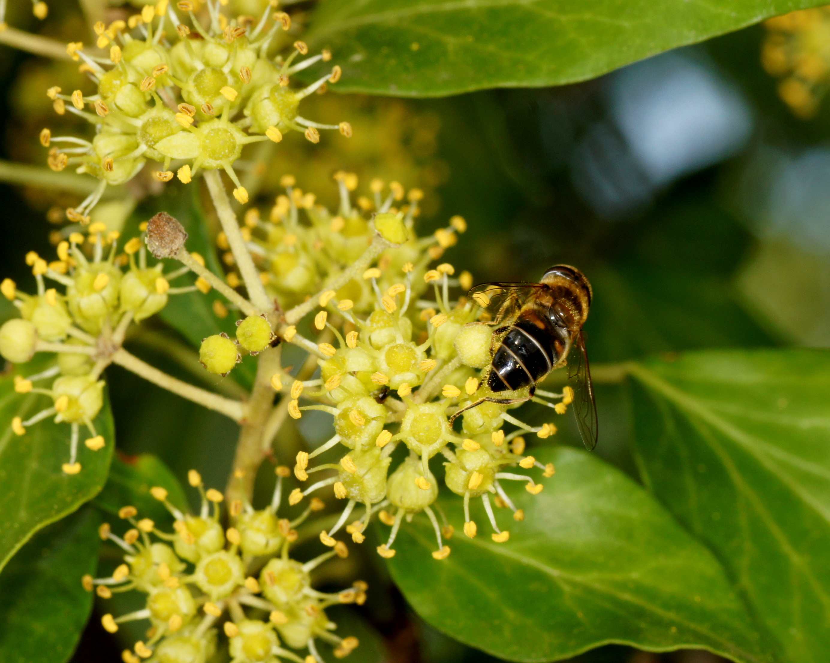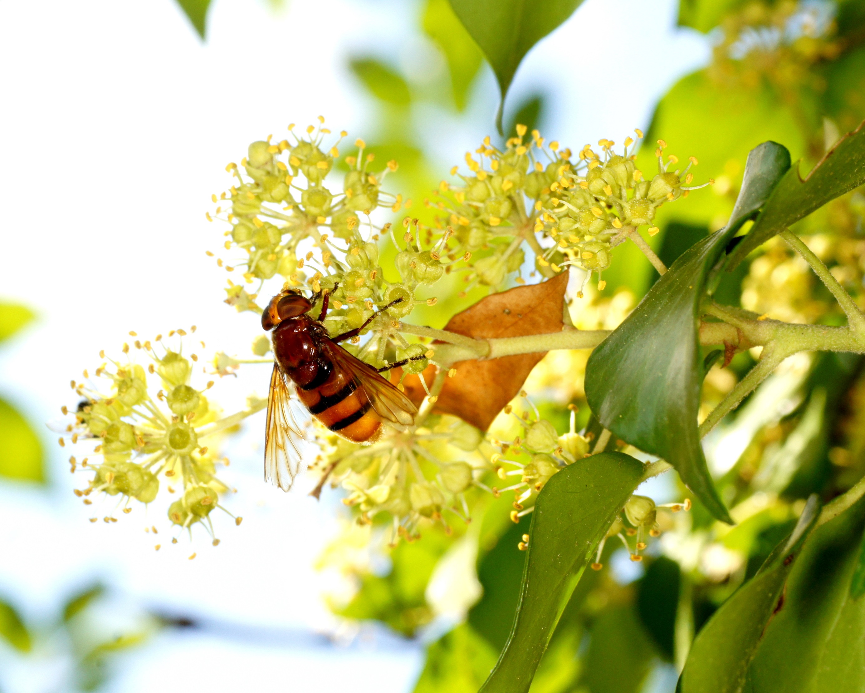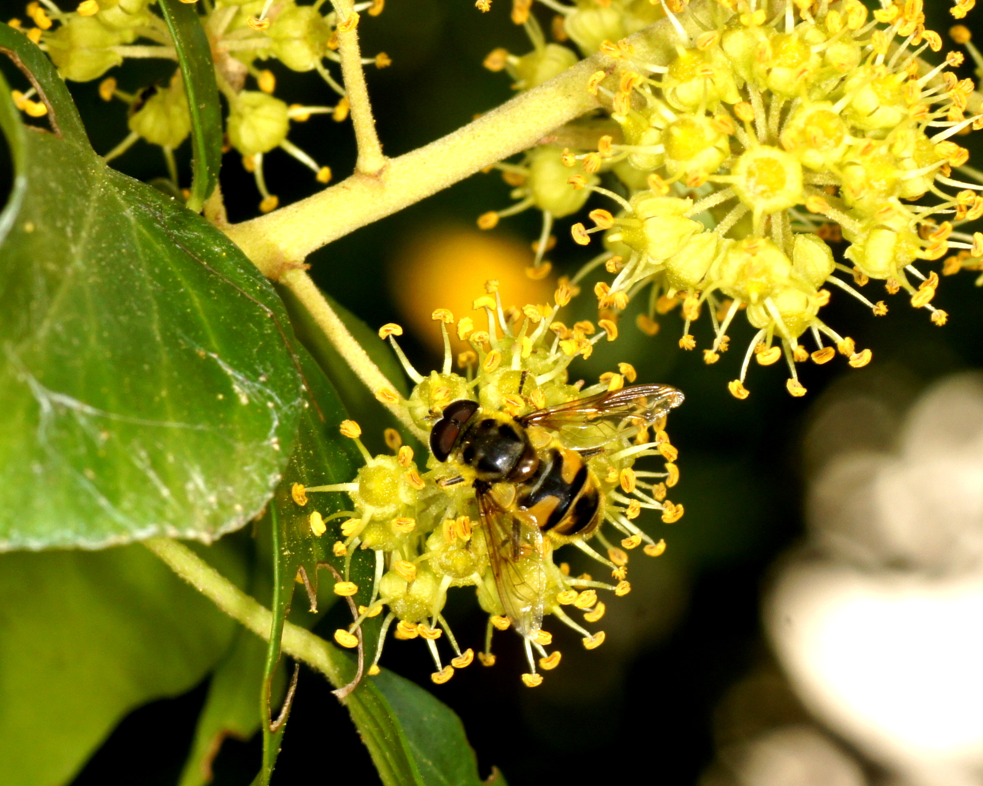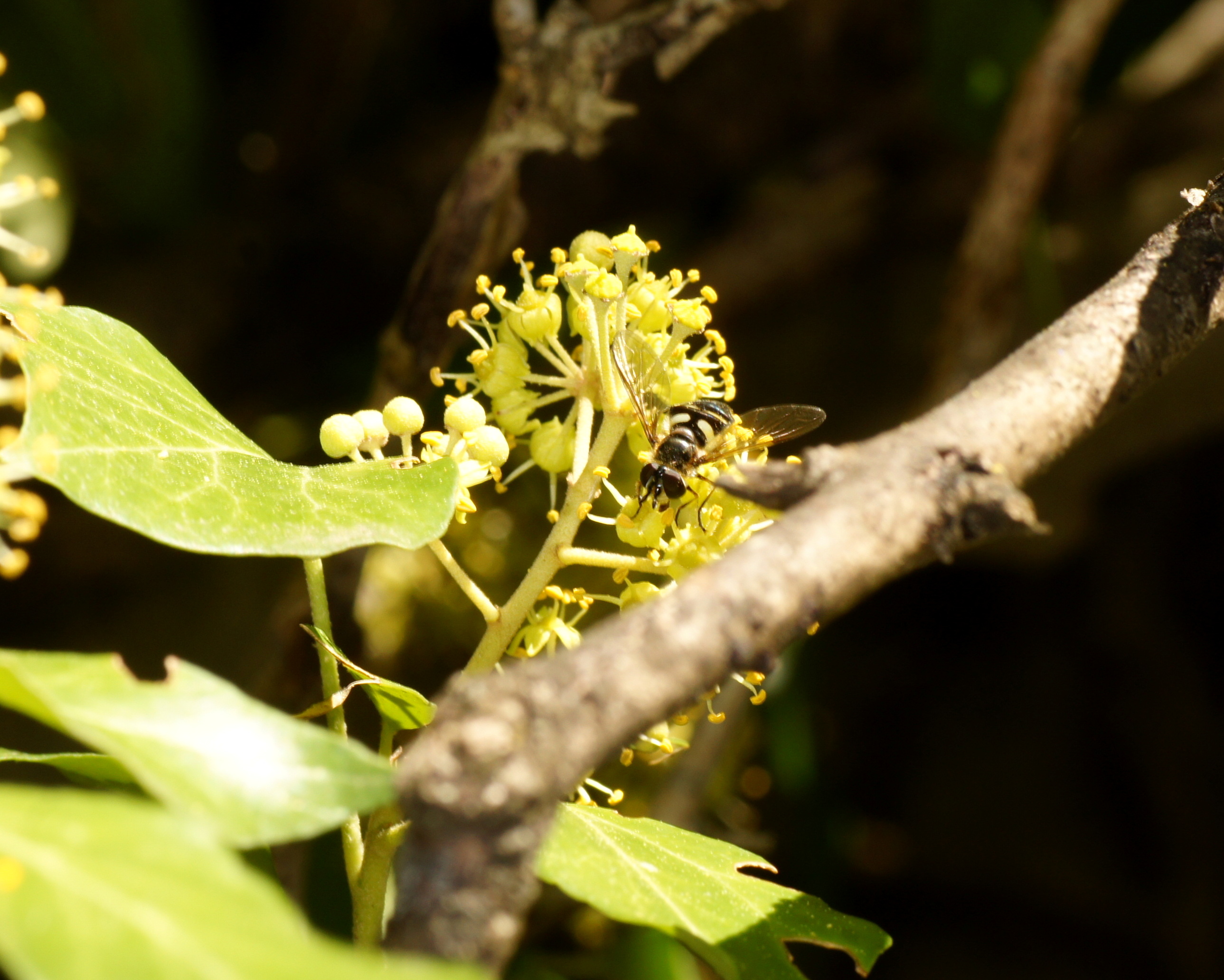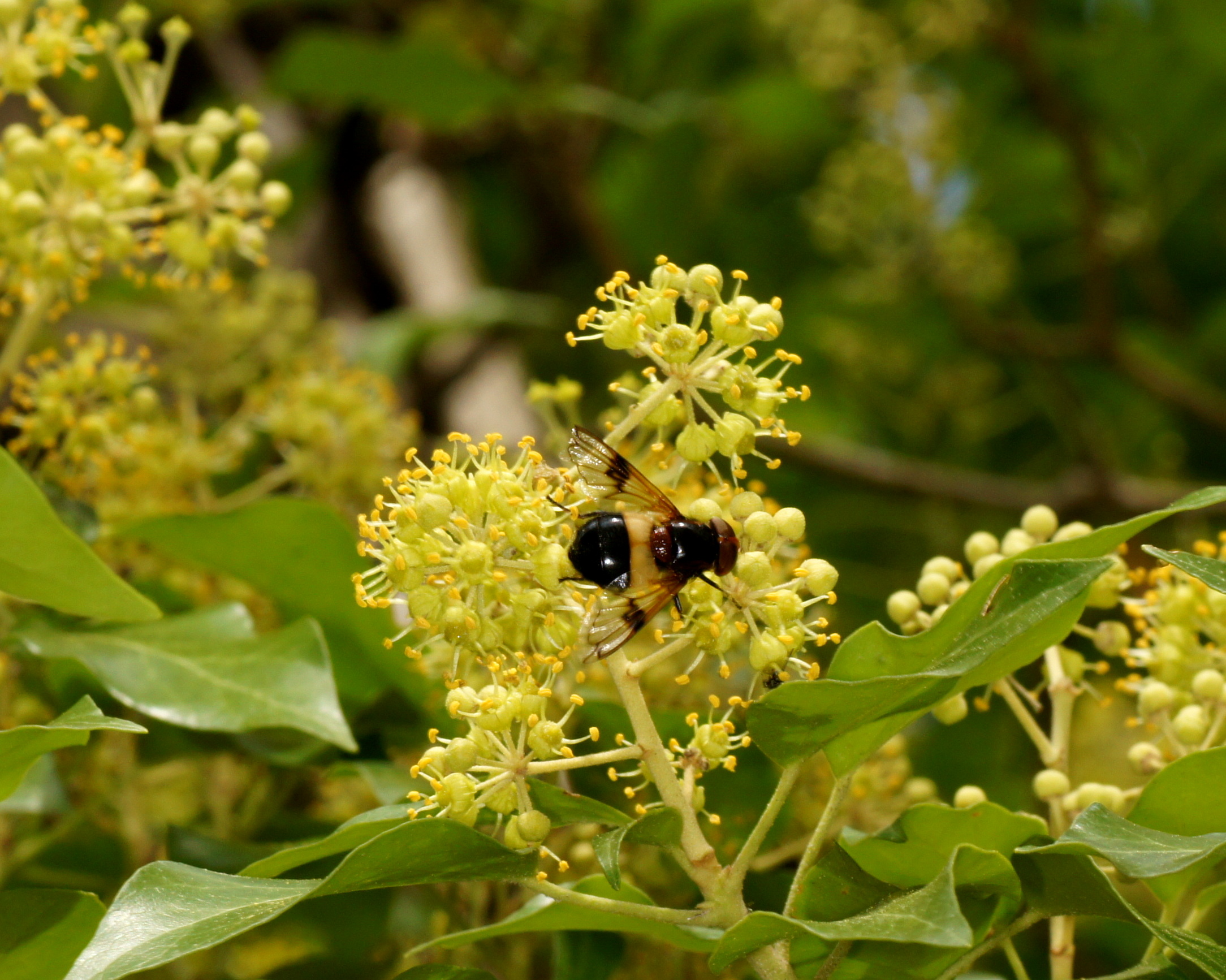 Der Efeu ist zwar eine giftige Pflanze, aber überall anzutreffen, in Gärten und im Freien. Er blüht im September, das ist ein später Zeitpunkt und daher für Insekten von großer Bedeutung. Die Blüten duften zudem sehr angenehm. Mein Efeu hat seit vielen Jahren ohne mein Zutun die inzwischen mächtige Mannaesche (Fraxinus ornus; fast 40 cm Stammdurchmesser) "erobert". Die Mannaesche blüht im Mai, der Duft ihrer Blüten ist noch in einiger Entfernung wahrnehmbar und ebenso ein Magnet für Insekten. Derzeit "summt" es unter dem Efeu wie unter einem Obstbaum im Frühjahr. Vor allem Schwebefliegen, Honigbienen, Fliegen, Vespula-Arten (V. germanica und V. vulgaris) und auch immer wieder ein bis zwei Hornissen. Letztere kann ich nicht fotographieren, sie sitzen nicht auf, sondern sind auf Beutefang aus. .....und das alles in der Stadt!