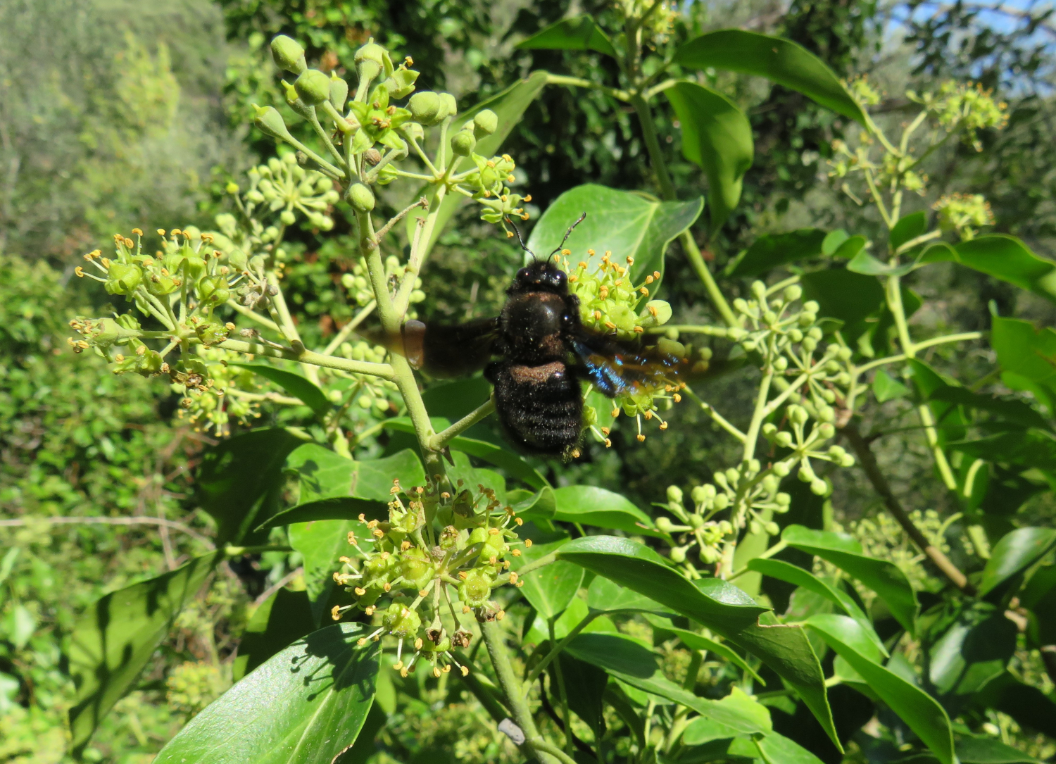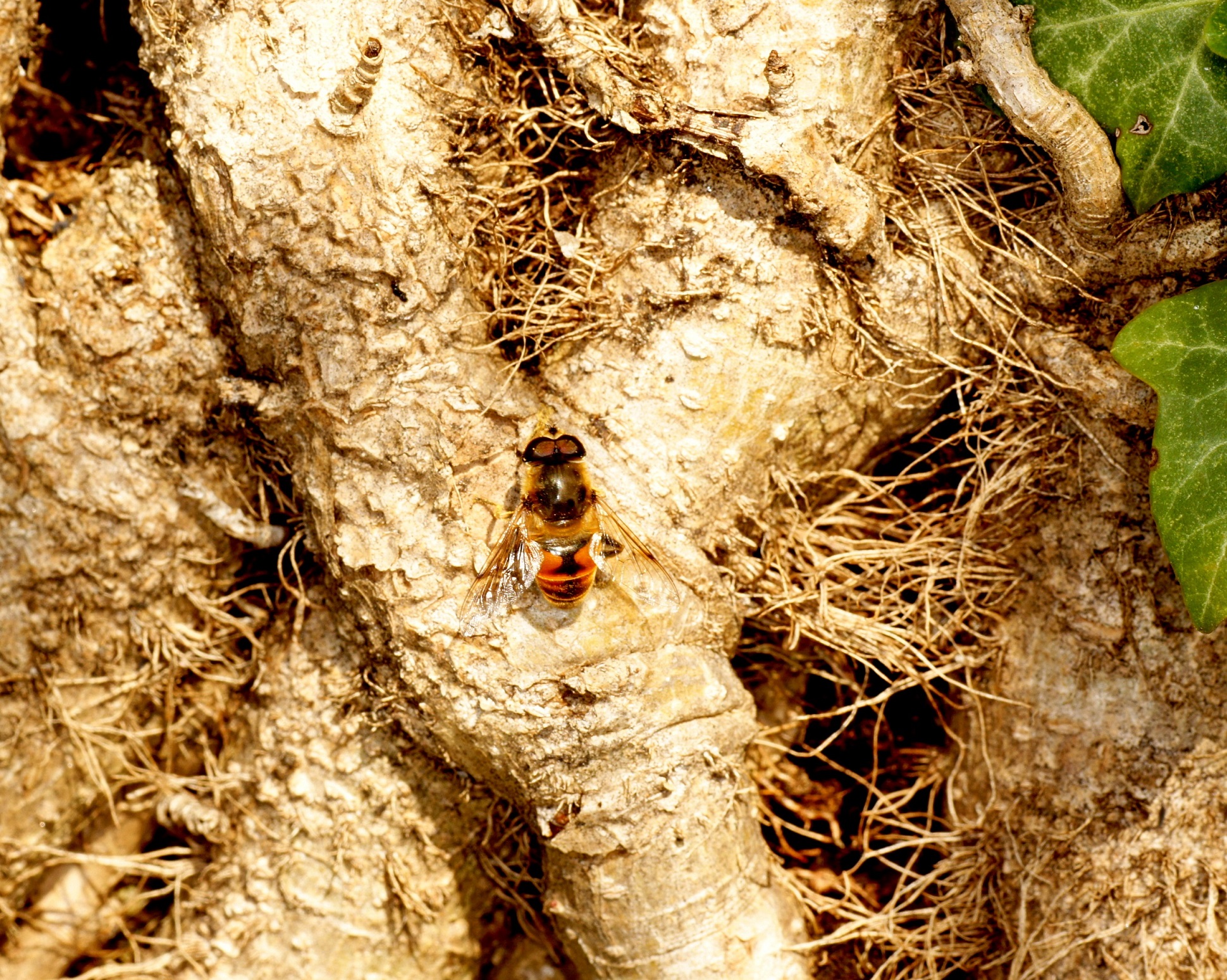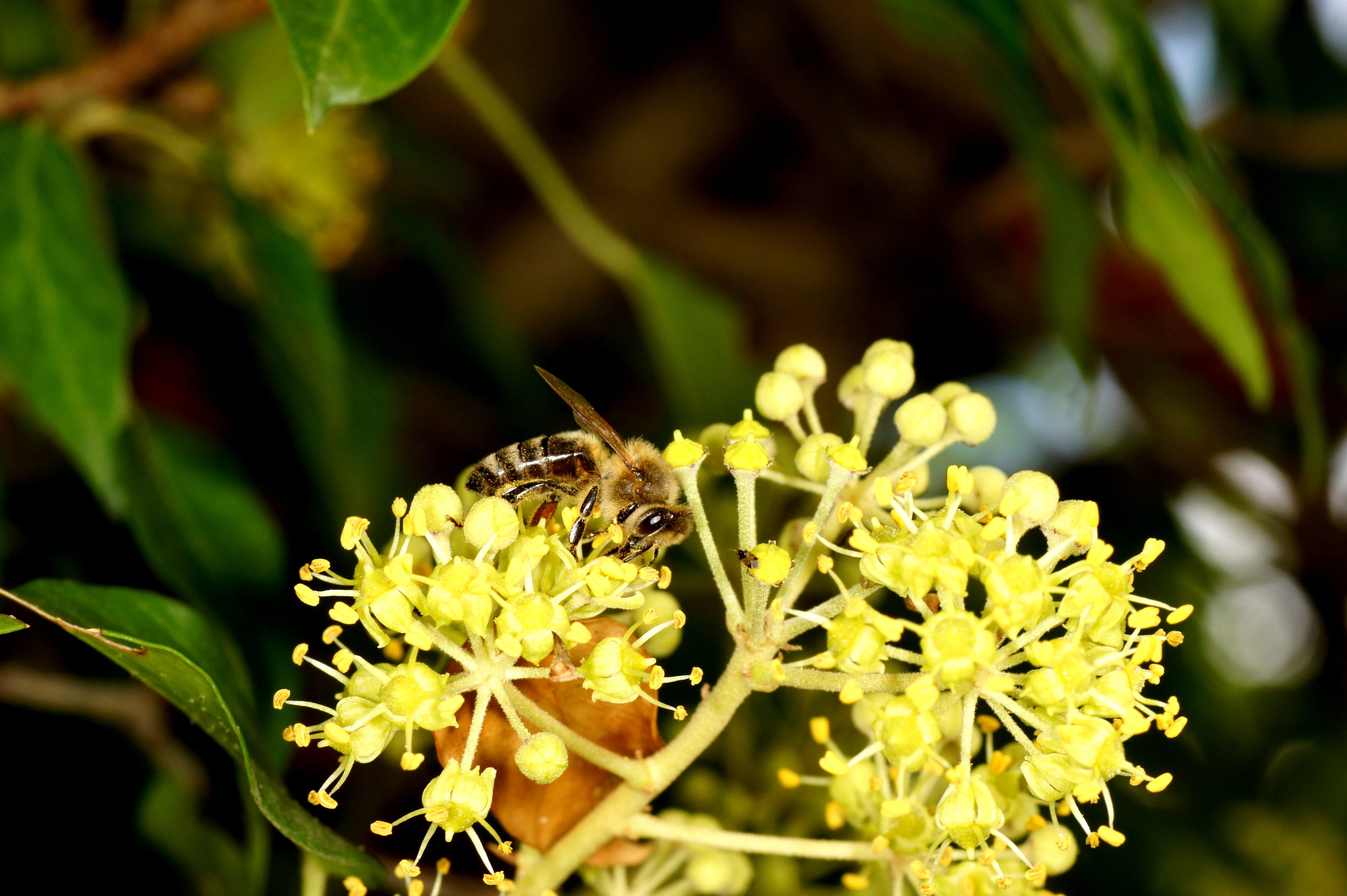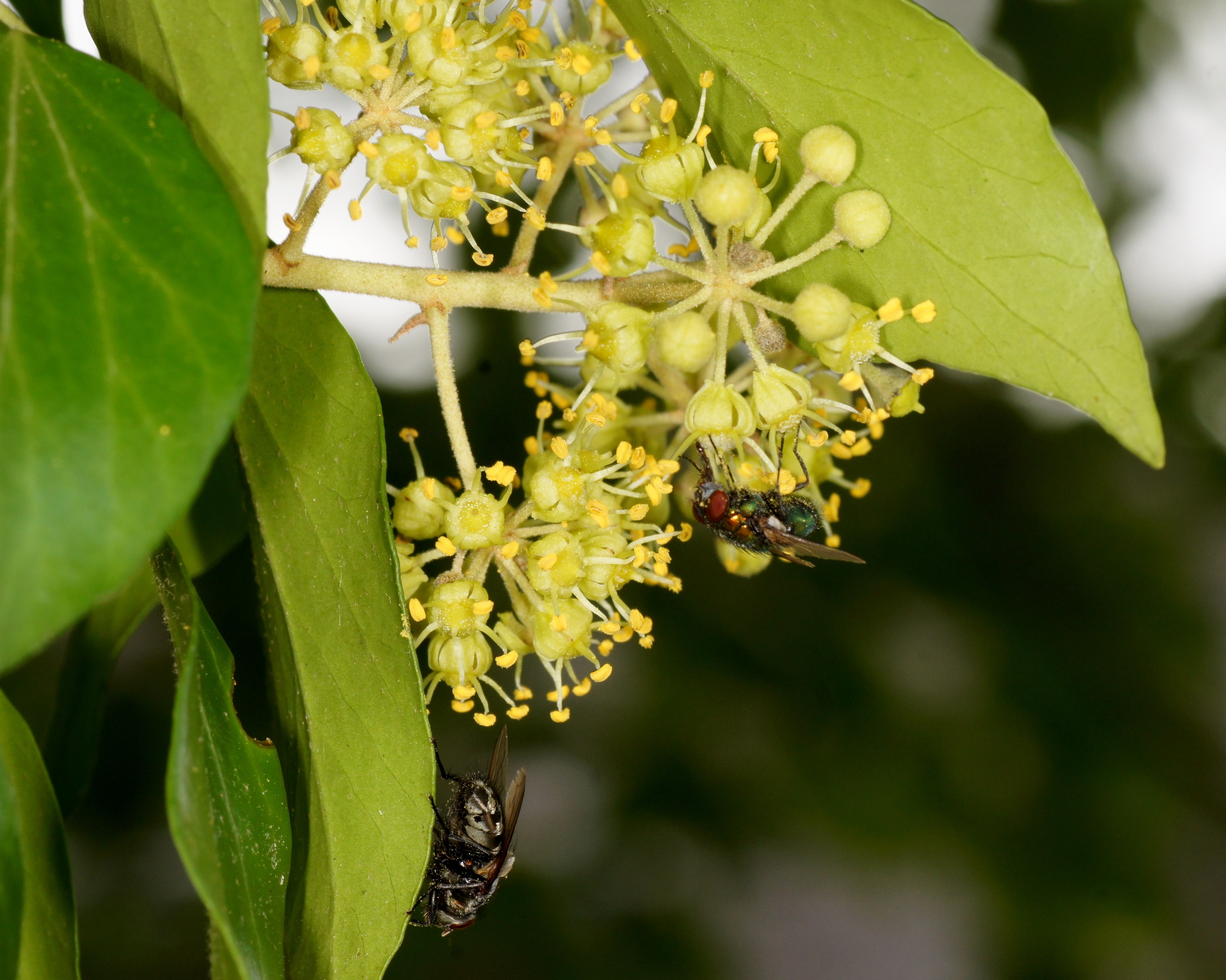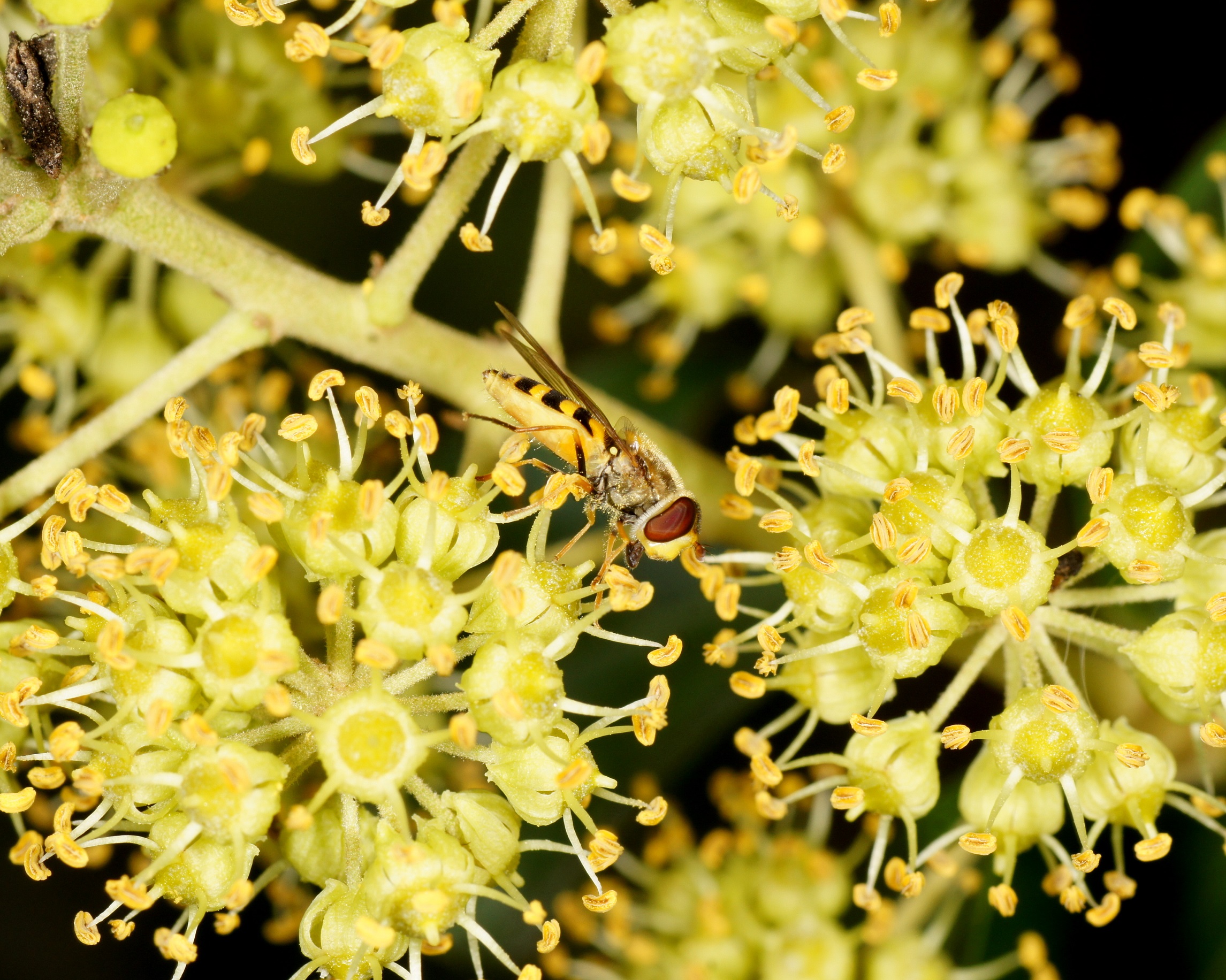 Der Efeu ist zwar eine giftige Pflanze, aber überall anzutreffen, in Gärten und im Freien. Er blüht im September, das ist ein später Zeitpunkt und daher für Insekten von großer Bedeutung. Die Blüten duften zudem sehr angenehm. Mein Efeu hat seit vielen Jahren ohne mein Zutun die inzwischen mächtige Mannaesche (Fraxinus ornus; fast 40 cm Stammdurchmesser) "erobert". Die Mannaesche blüht im Mai, der Duft ihrer Blüten ist noch in einiger Entfernung wahrnehmbar und ebenso ein Magnet für Insekten. Derzeit "summt" es unter dem Efeu wie unter einem Obstbaum im Frühjahr. Vor allem Schwebefliegen, Honigbienen, Fliegen, Vespula-Arten (V. germanica und V. vulgaris) und auch immer wieder ein bis zwei Hornissen. Letztere kann ich nicht fotographieren, sie sitzen nicht auf, sondern sind auf Beutefang aus. .....und das alles in der Stadt!
