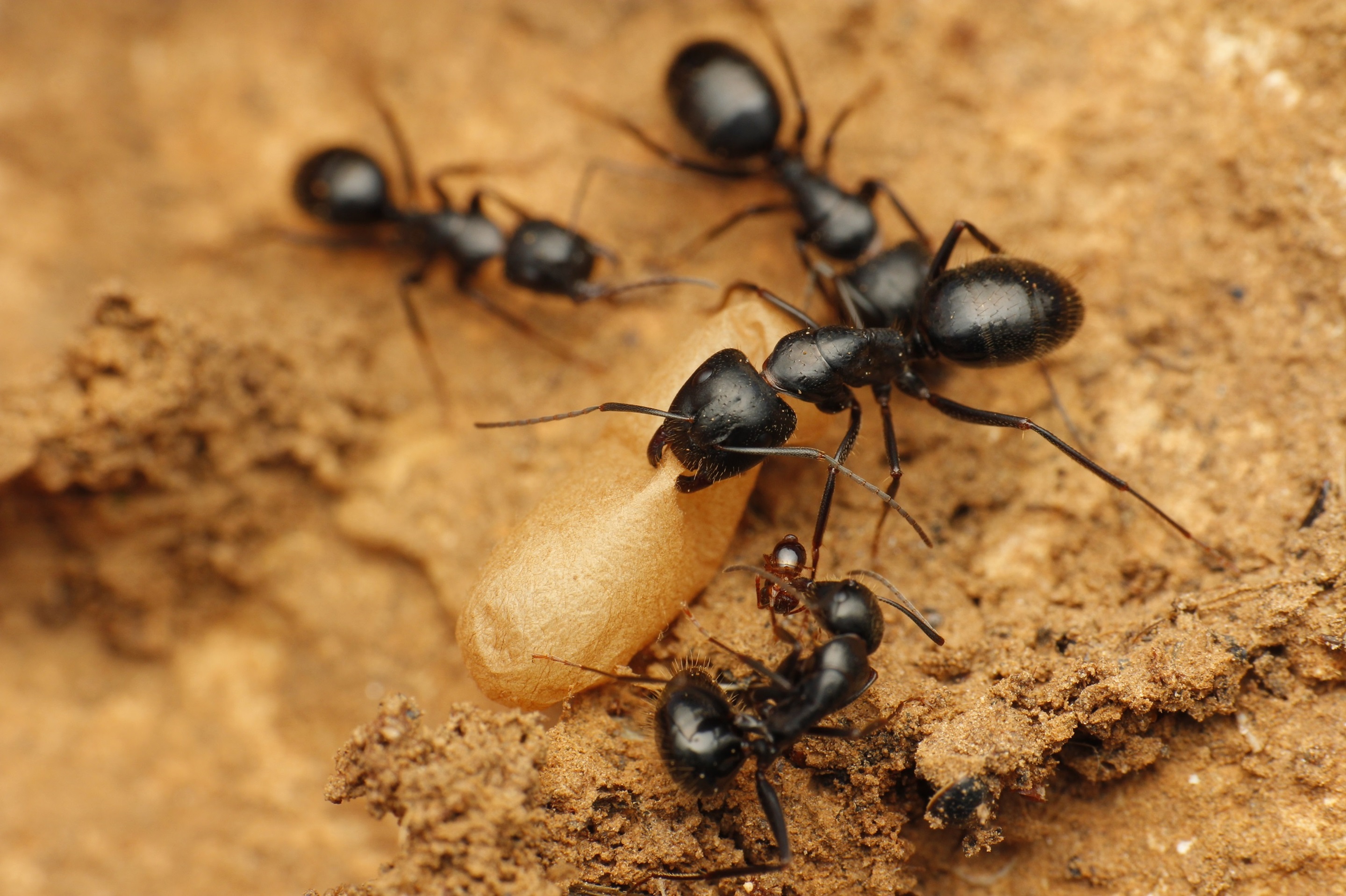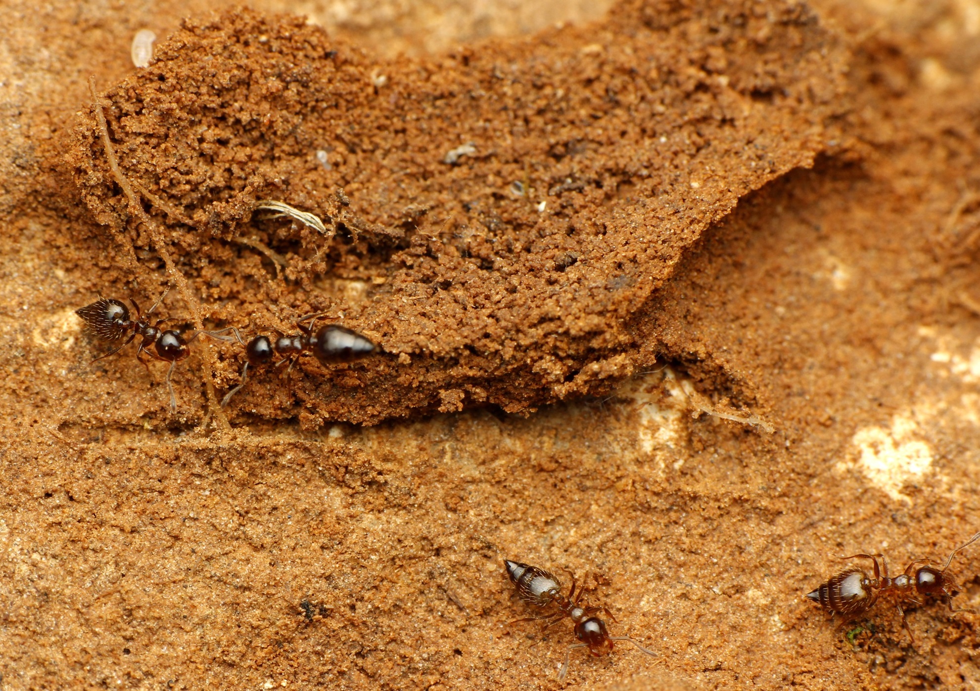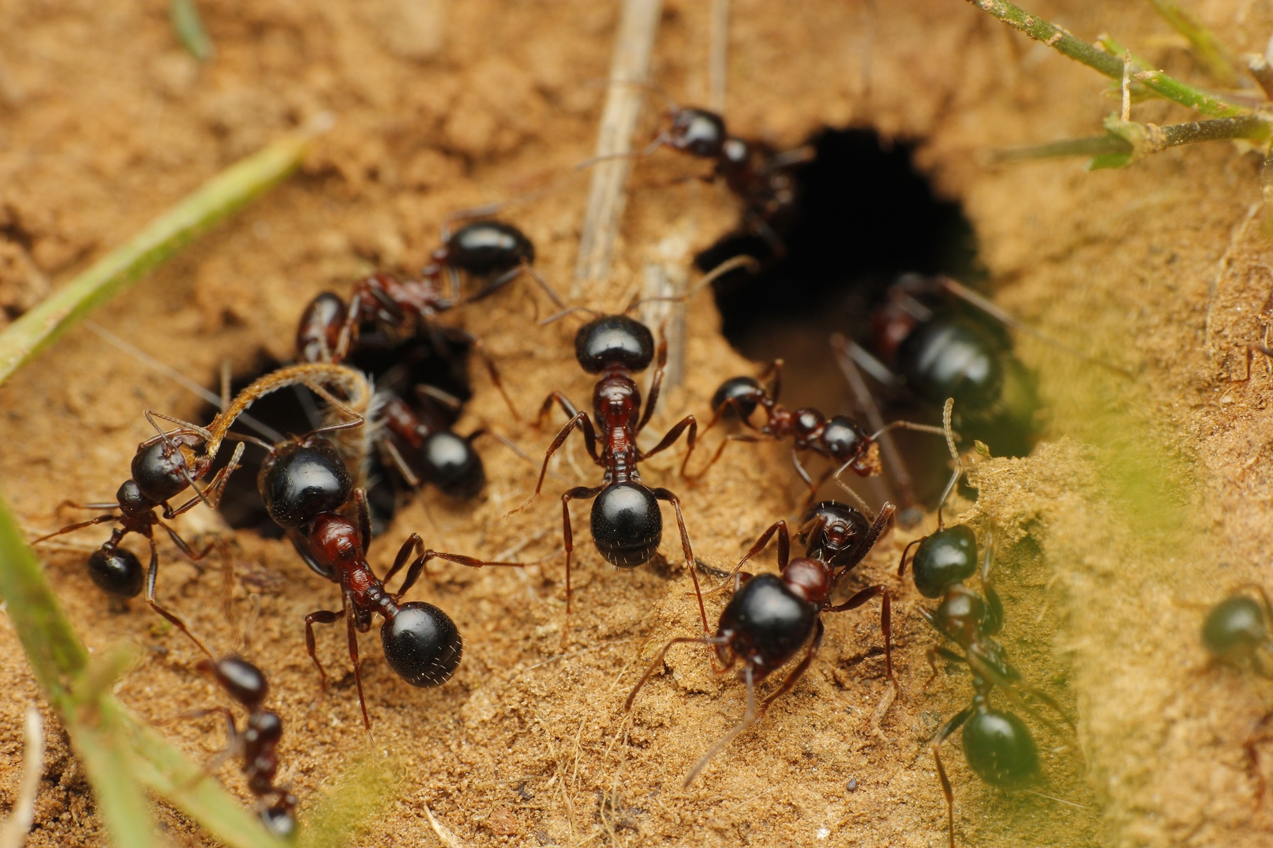 Camponotus aethiops, am unteren Rand ein Individuum im Kampf mit einer kleinen Ameise, vermutlich eine Arbeiterin von Pheidole.