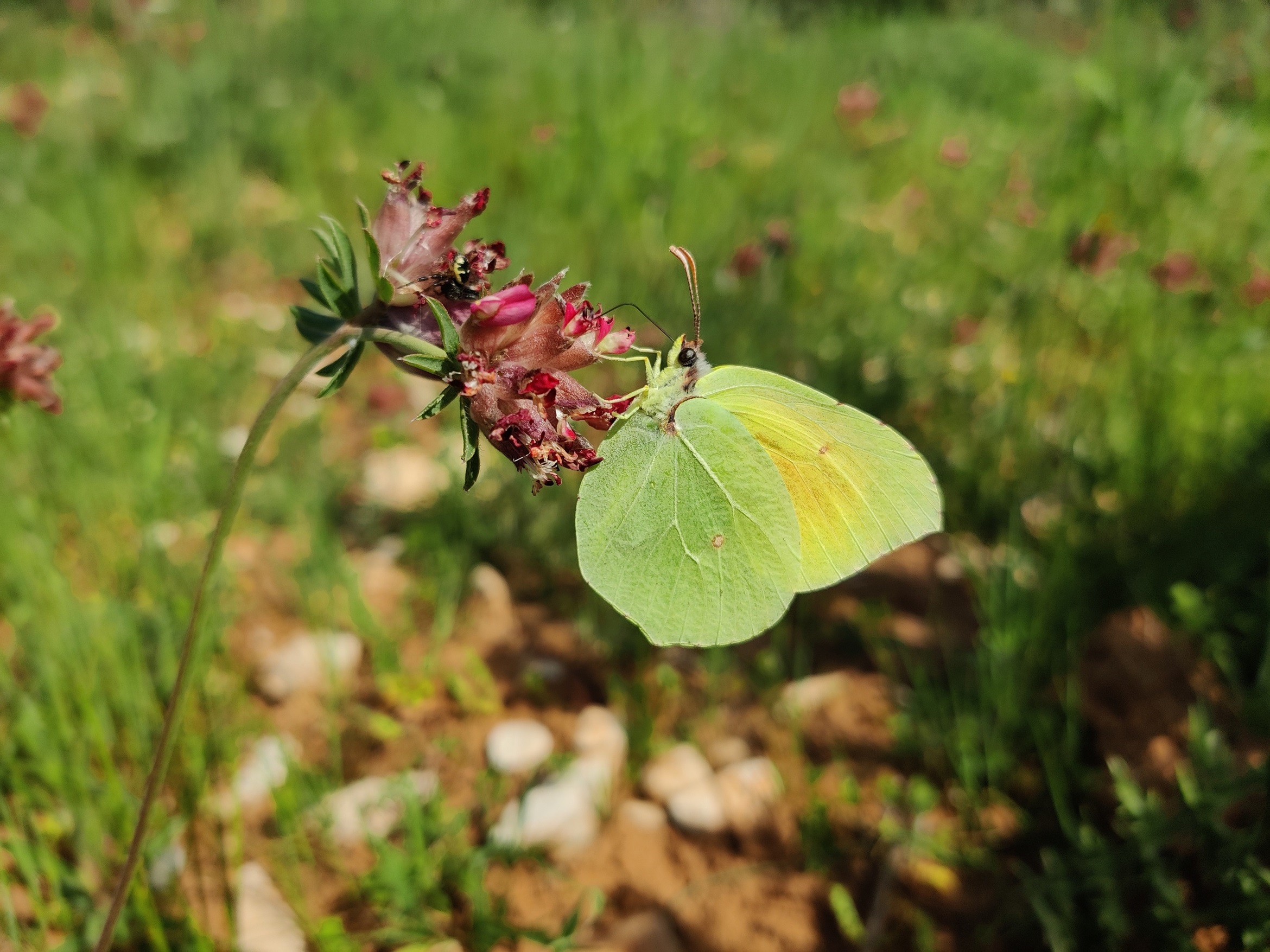 vermutlich ein Mittelmeer-Zitronenfalter. Am Blütenansatz lauert eine Spinne, hoffentlich ist sie gerade gesättigt!