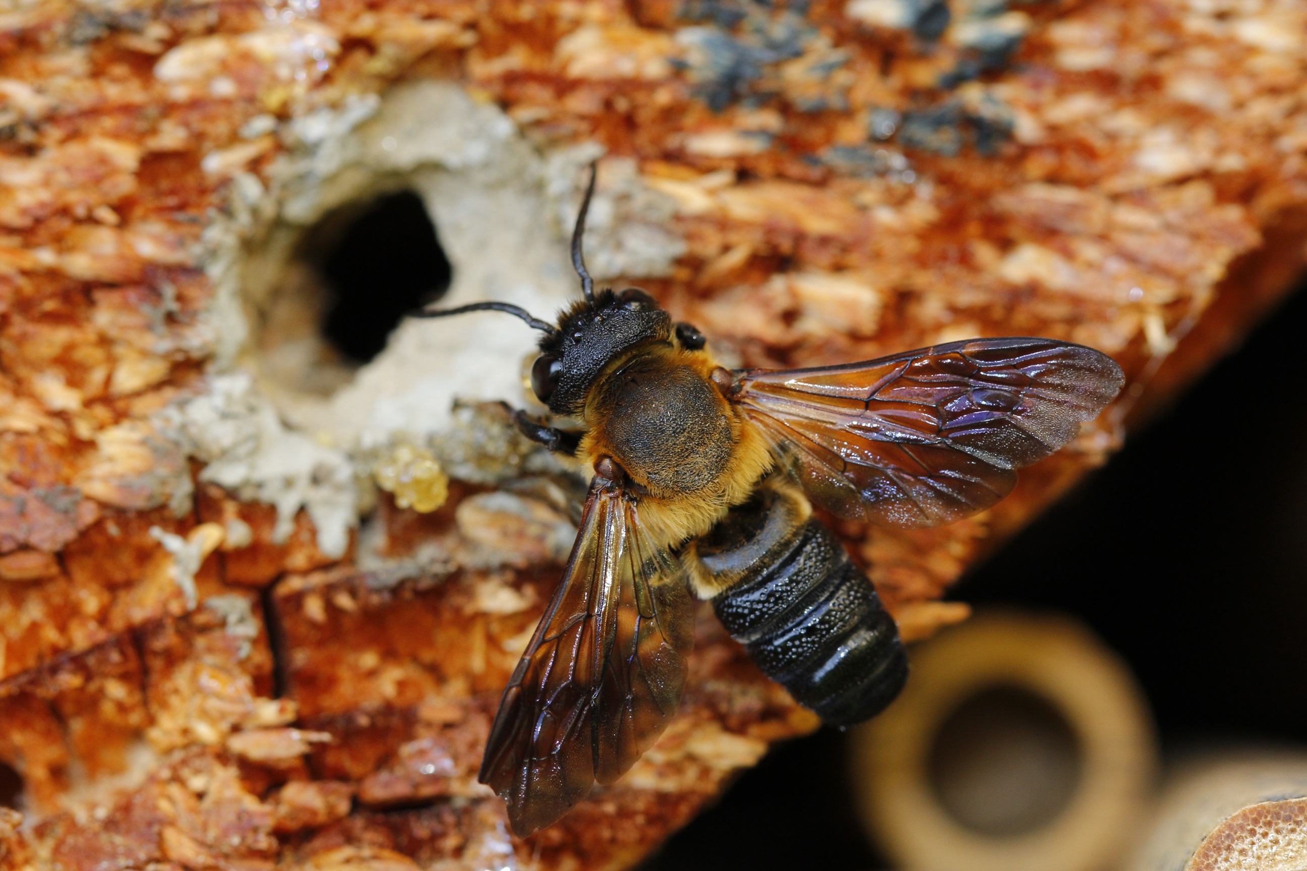 Ich beobachte die Bienenart jetzt das dritte Jahr, nach dem Wetter-Katastrophenjahr 2023 habe ich mir für 2024 nicht viel erwartet. Tatsächlich hatte ich in meinem Insektenhotel Anfang September immerhin 21 äußerlich versiegelte Wohnröhren. Die jetzigen Erfahrungen haben mich belehrt: Trotz der Länge der Wohnröhren von 10 cm in Holz und etwa 15-17cm langen Bambusröhren, wird offenbar in den meisten Wohnröhren nur eine od. viell. eine zweite Brutzelle im hinteren Bereich angelegt. Warum die Bienen hier so "zurückhaltend" sind, weiß ich noch nicht. M. sculpturalis ist ein Neozon aus Ostasien stammend, dem starke Vermehrung und invasives Potential zugeschrieben werden.