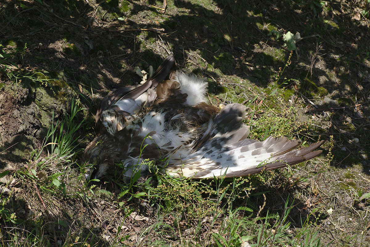 Zu guter Letzt fand ich auch noch einen toten Raubvogel am Straßenrand, dem schon die Maden aus den Augen krochen