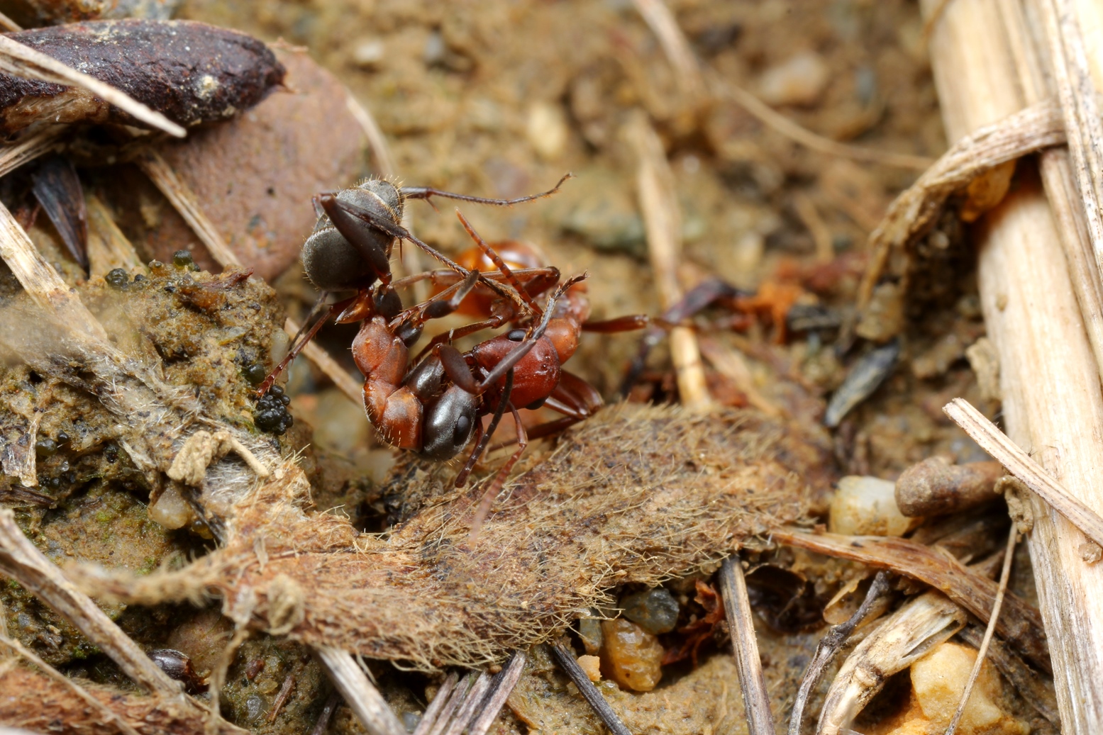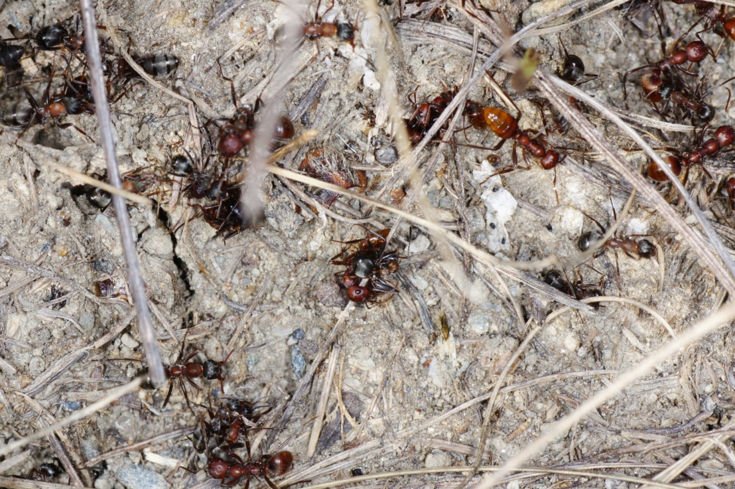 Wie ich schon mehrfach berichtet habe, gibt es bei Überfällen von Polyergus auf Formica rufibarbis-Nester nicht selten heftige Auseinandersetzungen, die auch mit Toten enden können. F. rufibarbis ist bei uns die größte Serviformica-Art und gilt als aggressiv und gegen Sozialparasiten relativ widerstandsfähig. Interessant sind aber Meldungen von usern vor allem aus dem subpannonischen Raum (Ostösterreich), wonach sie kaum jemals Kämpfe zwischen den Kontrahenten beobachten konnten und es gibt zudem ausgesprochene Experten, die nicht glauben können, dass dabei auch Amazonen hin und wieder zu Tode kommen.