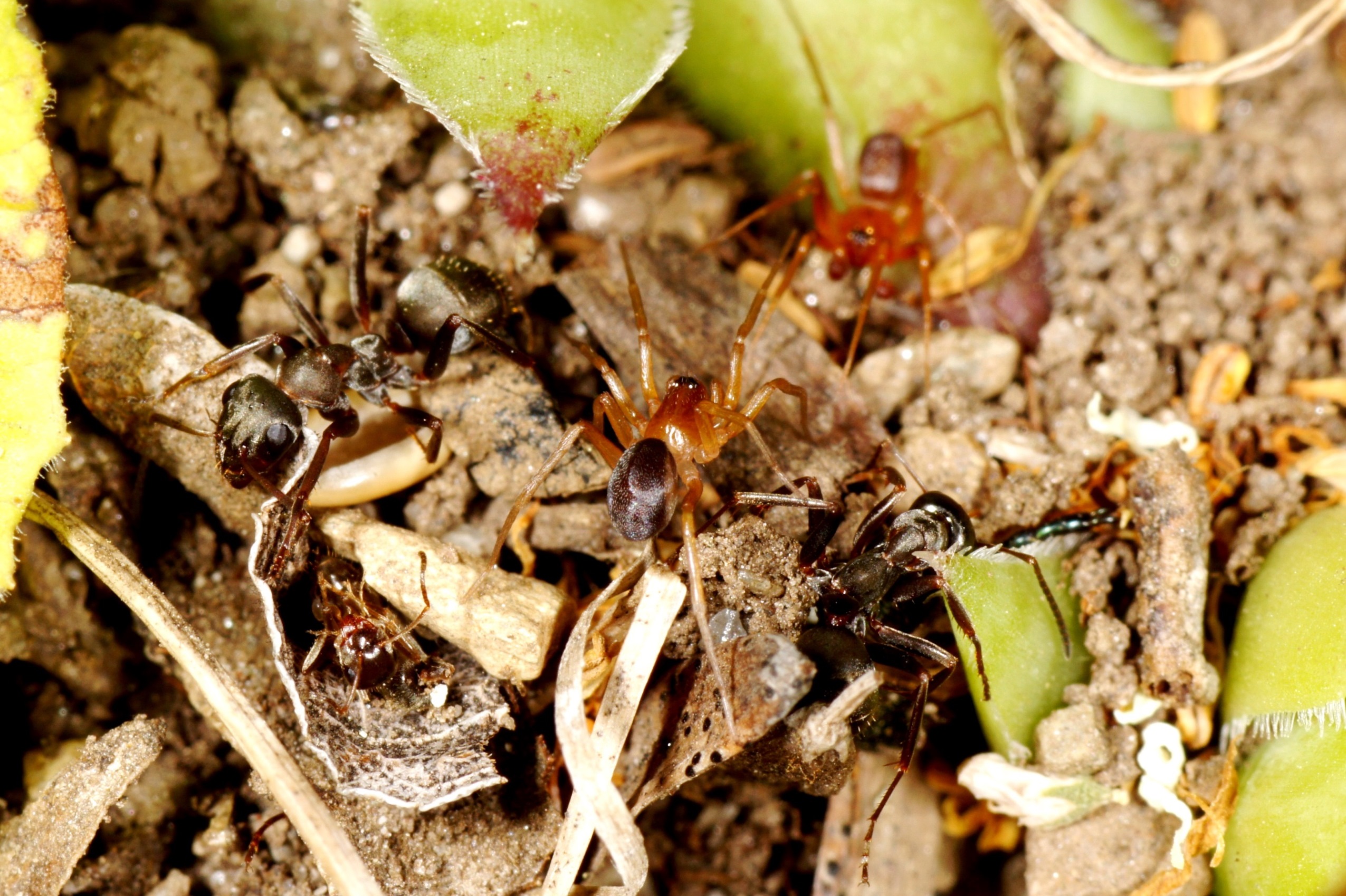 1. Ich rede in diesem Fall von Callilepis nocturna und Callilepis schuszteri. In mehrjähriger Beobachtung und zweijähriger Feldforschung konnte ich feststellen, dass beide Spinnen-Arten in größeren juvenilen Stadien und als adulte Spinnen eine ausgeprägte Präferenz für Camponotus vagus als Beute zeigen. Vermutlich handelt es sich um eine regionale Erscheinung, weil im Untersuchungsgebiet alle drei Kontrahenten (zufällig ?) hohe Bestandsdichten aufweisen. Es ist aber erstaunlich, dass sich die Spinnen ausgerechnet an eine der wehrhaftesten Ameisen heranwagen, obwohl sie sich in anderen Regionen von verschiedenen Ameisenarten ernähren.