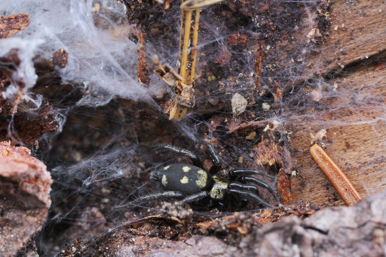 Im liegenden Totholz (Nest v. C. vagus) versteckt sich die Spinne in winzigen Ritzen und Hohlräumen der Borke.