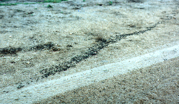 Immer wieder sahen wir einzelne dieser Duftbomben mit Beute. Bevorzugt sind Termiten, die sie Richtung Nest tragen. Aber im Chobe-Nationalpark (Botswana) konnten wir auch geordnete Raubzüge von Megaponera sehen. Zuerst dachte ich, es handle sich um einen Zug der berühmten Heeres- oder Wanderameisen (Dorylinae): In raschem Lauf überquerte die Truppe die Sandpiste vor dem Auto (Abb.2).