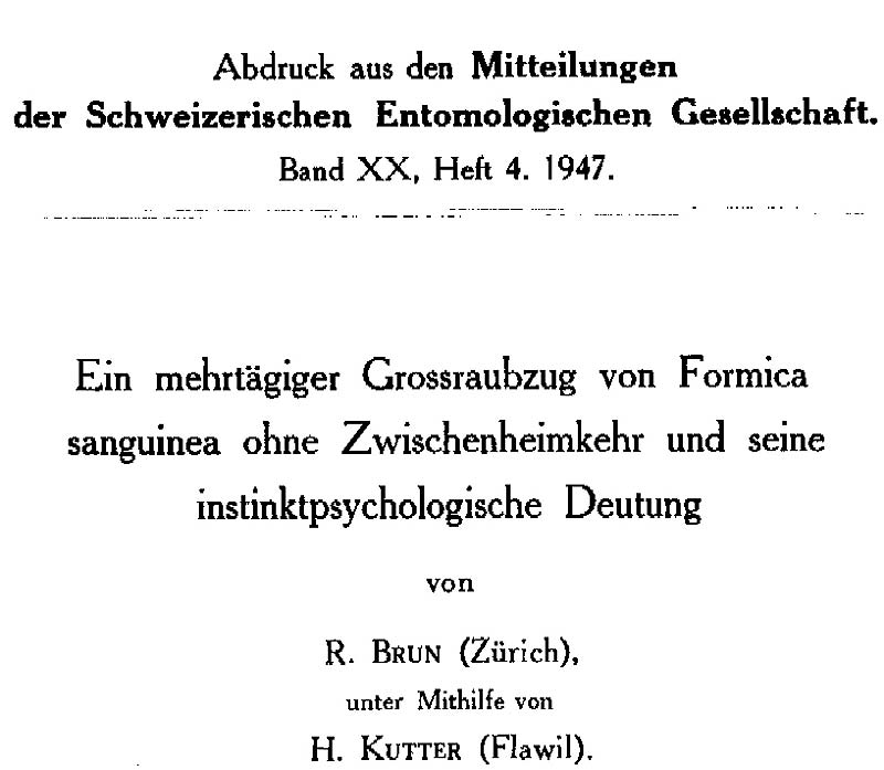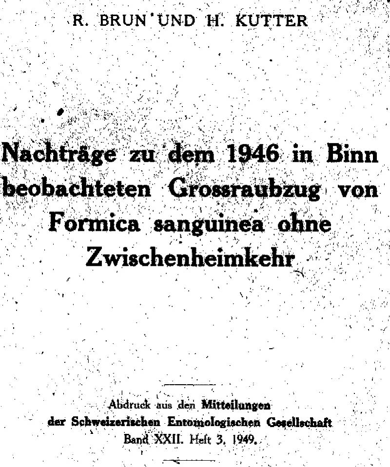 Bei Binn im Wallis führt jenseits des tosenden Baches ein schmaler Fahrweg zum malerischen Kirchlein hinauf. Sehr wahrscheinlich ahnte kaum je ein Kirchgänger, dass sich auf diesem Strässchen jeweils im Juli während mehrerer Jahre dramatische Kriegsereignisse abgespielt haben. Längs dem Bach entlang hatten sich damals eine grössere Anzahl fusca-Kolonien häuslich eingerichtet. Auf der Bergscite wird der Pfad von einem abschüssigen Grashang begrenzt. Darüber befinden sich Gebüsche und ein verstecktes Felsband. Oberhalb dieser Felsen befand sich die Burg eines ansehnlichen sanguinea-Volkes. Die lineare Distanz von Burg zum Weg beträgt 60 m bei mindestens 20 m Höhendifferenz. Dieses Räubervolk plünderte nun ohne Unterbruch eim fusca-Nest nach dem ändern aus und dehnte seinen Aktionsradius schliesslich bis gegen das Kirchlein, das heisst bis auf eine Distanz von 170 m aus. Die erbeutete Puppenmenge war derart gross, die Gelegenheit derart günstig, der Heimweg aber jeweils derart beschwerlich, dass die Räuberinnen dazu übergingen, ihre gestohlenen Lasten nicht, wie üblich, sofort heimzuschaffen, sondern sie unter passenden Steinen auf der andern Wegseite zu deponieren und dort von einer Garnison bewachen zu lassen. Der eigentliche Heimtransport aus diesen provisorischen Depots erfolgte jeweils erst in den Abendstunden, zu einem Zeitpunkt, in welchem alle Kämpfe, der kühleren Temperatur wegen, aufhören. Ein aufmerksamer Beobachter konnte dann hunderte Puppen tragender Einzeltiere im hohen Gras bergwärts klettern sehen. Schliesslich bekamen die nie ganz leer werdenden Depots den Charakter und Rang von Ersatznestern und wurden durch den Zuzug von jungen Königinnen aus dem Hauptnest zu eigentlichen Zweignestern. Jetzt wurden die Depots nicht mehr entleert, die Erde unter den Steinen wurde ausgehoben und mit vielen Gängen durchzogen, die neu hinzugebrachtcn fusca-Puppcn nicht mehr aufgestapelt, sondern ordentlich arrangiert. Alle weiteren Details dieser 1946 und 1948 beobachteten Feldzüge sind in den Mitteilungen der Schweizerischen Entomologischen Gesellschaft zu finden (R. BRUN und H. KUTTER, 1947 und 1949).