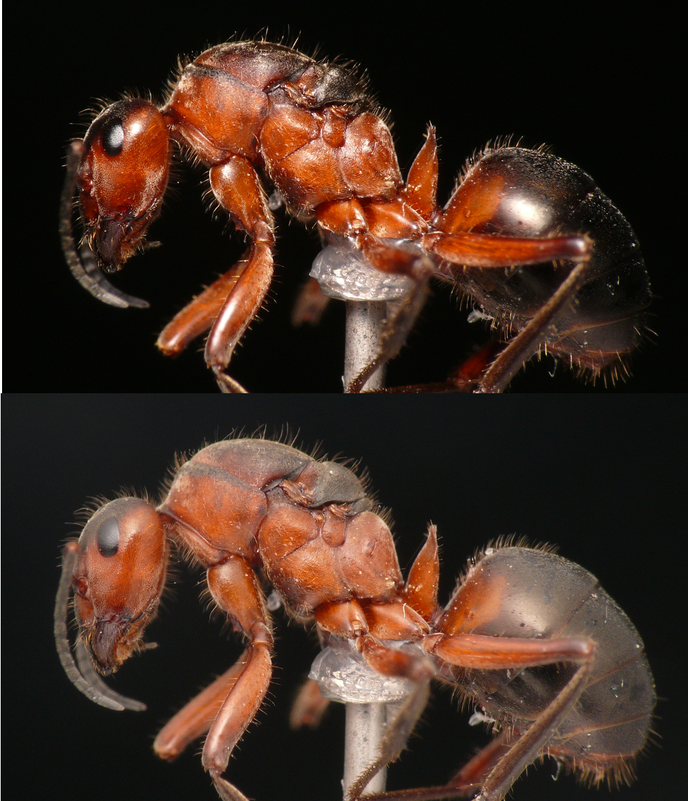 Die Anzahl der einzelnen Bilder hängt ganz vom fotografierten Maßstab ab. Für eine laterale Ansicht einer recht großen Ameise, wie der Formica, benötige ich nur bis zu 10 geblitze Aufnahmen. Wobei das Bild der Formica-Königin tatsächlich nur aus einer einzelnen Aufnahme besteht!