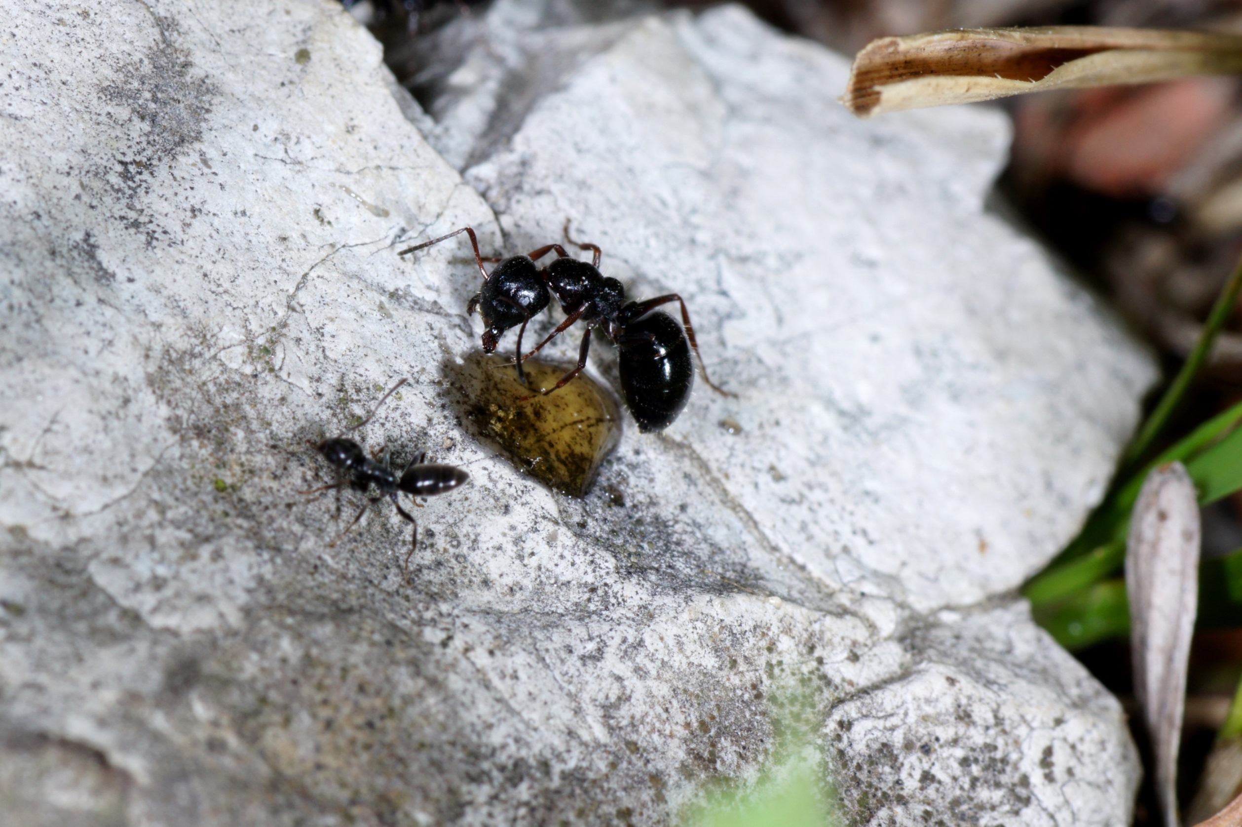 Eine Major-Arbeiterin v. Camponotus piceus ist an der Futterstelle. Eine einzelne Tapinoma nähert sich und will auch mitnaschen. Die Drohgebärden beider Kontrahenten sieht man am Foto, unmittelbar danach kam es zum Kontakt. Die Tapinoma konnte etwas Gift abstreifen u. sofort torkelt die Camponotus benommen davon. Die Tapinoma blieb siegreich und und kam anschließend zur Futterstelle!