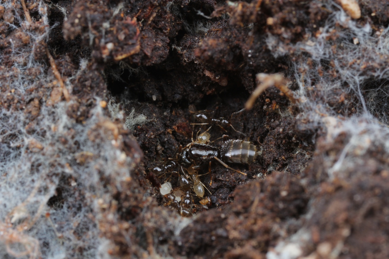 Hier wird eine Beute erspäht: Eine tote Myrmica sp.