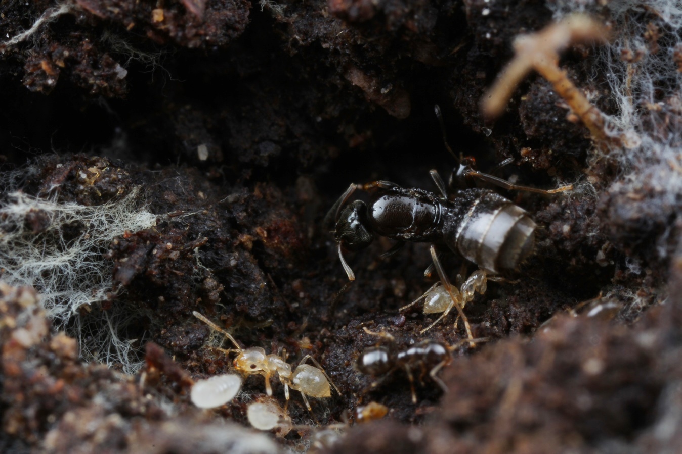 Tapinoma subboreale gehört auch zu den "Frühaufstehern" im Reich der Ameisenfauna: 2007 gab es einen ausgesprochen milden Spätwinter, etwa Mitte Februar entdeckte ich diese Tapinoma-Schar unter einem von der Sonne etwas erwärmten Stein. 2 Tage später gab es bereits Eierpakete.