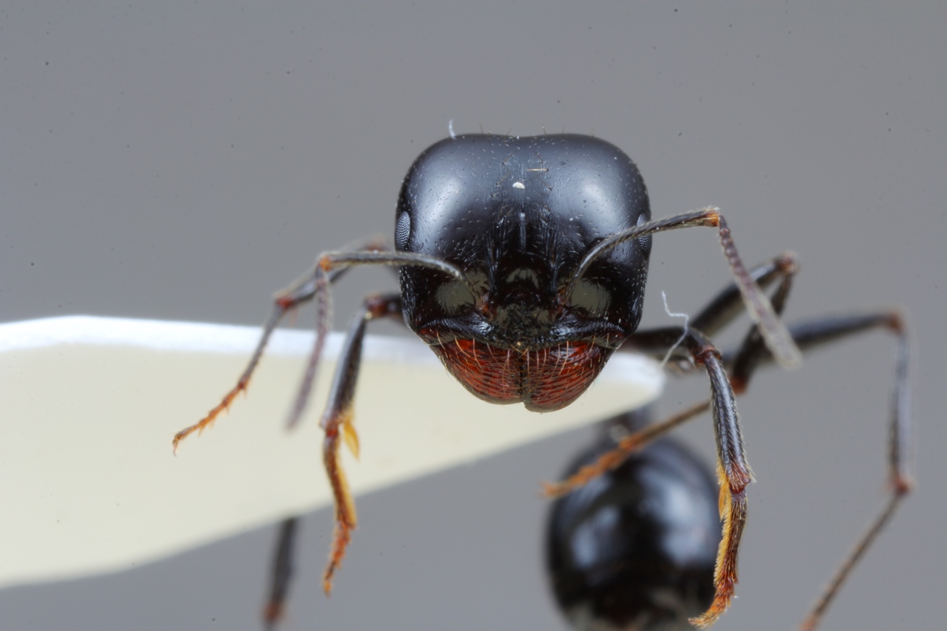 Präparat frontal. Der Kopf der Majorarbeiterin ermöglicht breit gesetzte Mandibelansätze mit der entsprechenden Muskulatur, die eine gute Hebelwirkung ermöglichen