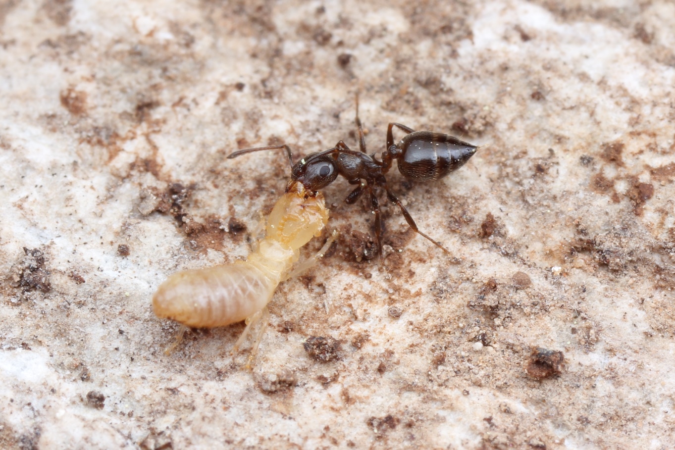 Termiten sind mit den Ameisen phylogenetisch nicht verwandt, sondern gehören zu den Schaben. Es gibt einige Ameisenarten, die Termiten als willkommene Beute ansehen. Es ist aber nicht leicht an diese heranzukommen, da Termiten entweder in Holz oder in Erdbauten leben und mitunter das Nest mit Hilfe einer eigenen Soldatenkaste schützen. Der Kontakt wird manchmal unerwartet herbeigeführt, wenn etwa ein Stein oder ein Stück Totholz vom Boden abgehoben wird. So ist es auch in diesen Fällen geschehen.......[Fotos v. Roman Borovsky]