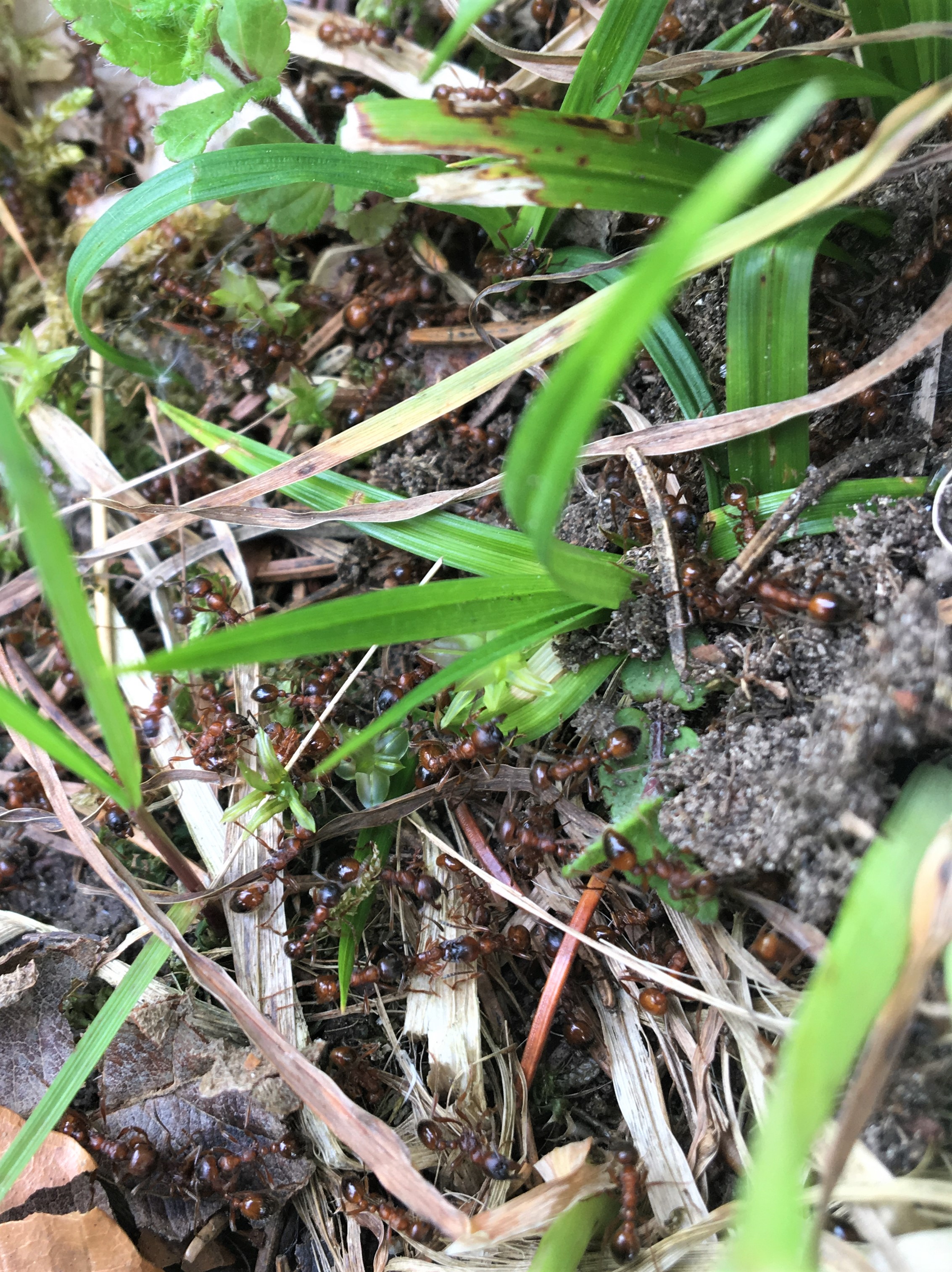 Bei einem Nest, welches auf einer Kiesstrasse entlang eines Flusses liegt, schien der Schwarmflug scheinbar kurz bevor zu stehen. Ich sah zwar keine Geschlechtstiere, aber jede Menge Arbeiterinnen, die aufgeregt in der Umgebung umher liefen. Auf den zweiten Blick wurde aber augenfällig, dass sich die Bewegung deutlich in eine Richtung abzeichnete. Auf ca. einem Meter breite liefen viele Tiere auf den Auslauf einer Wiese zu, die sich am linken Wegrand befand. Wiesen sind allerdings kein typisches Habitat der Art, hohes Gras wird normalerweise gemieden. Der Marsch aber führte fast zwei Meter weiter durch die Halme und fand sein Ziel kurz vor einem Waldrand.