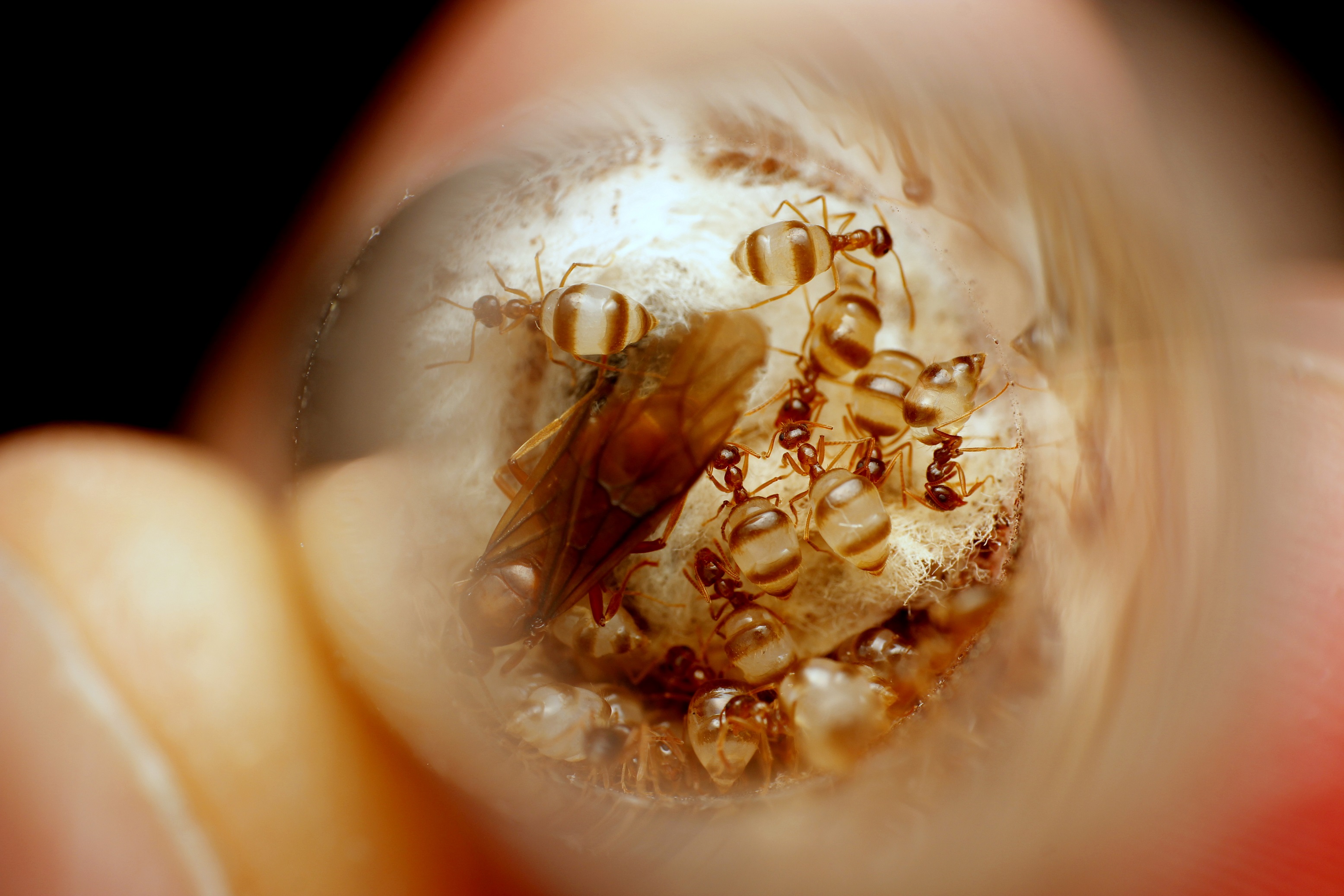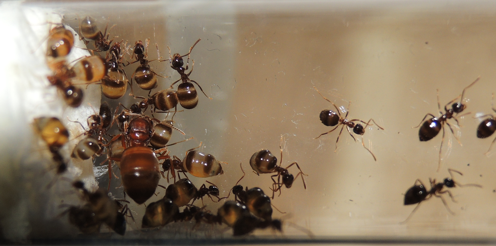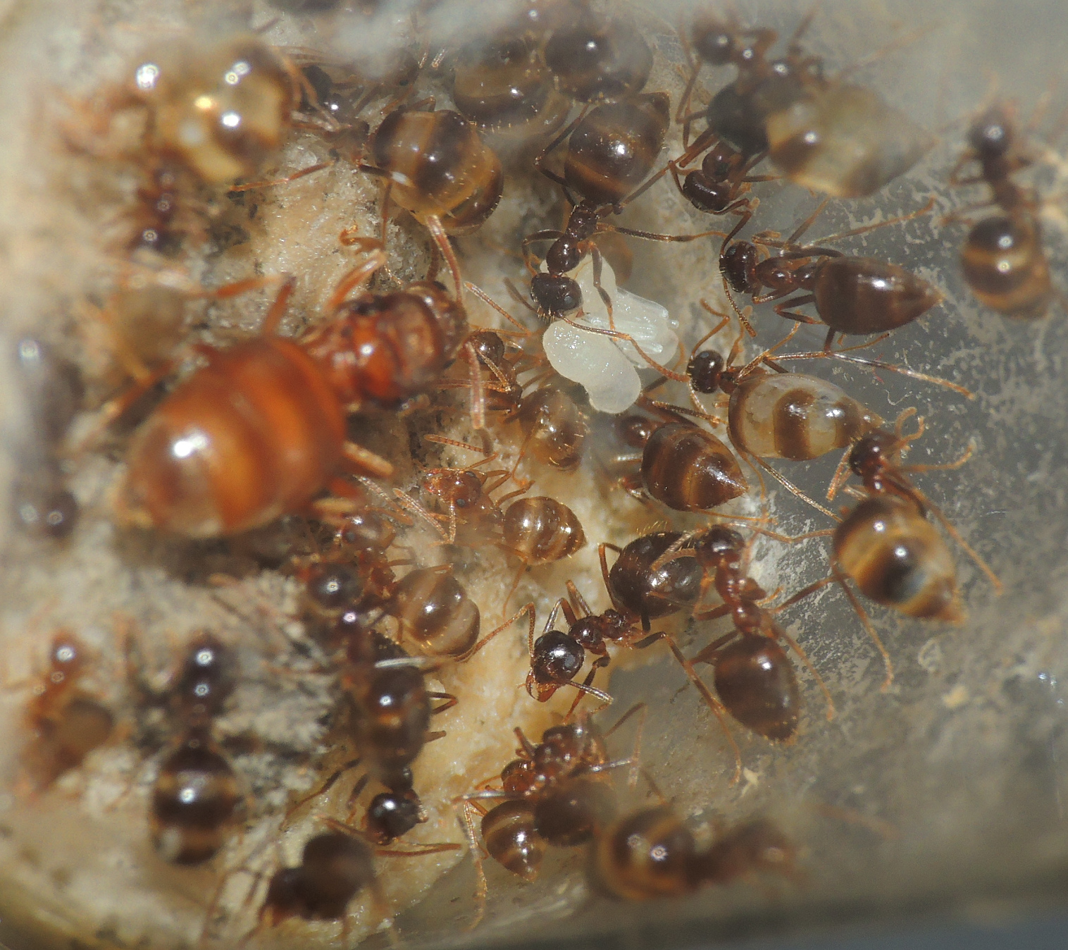 Das ist die Gründungskolonie von Prenolepis nitens. Vor allem der Sohn betreut sie (die Fotos sind von ihm), aber es gibt bisher nur Probleme: Das Volk bleibt sehr klein, Eier werden gelegt und später wieder aufgefressen. Die Parameter der Haltung müssten passen (Nahrung, Temperatur, Feuchtigkeit). Die Population wurde schon in ein Holznest umgesiedelt, auch dort hat es nicht geklappt; jetzt ist sie wieder im Glasrohr. So viele Schwierigkeiten bei einer Nestgründung hatten wir schon viele Jahre nicht mehr. Zurück bleibt ein wenig Ratlosigkeit.........................................................