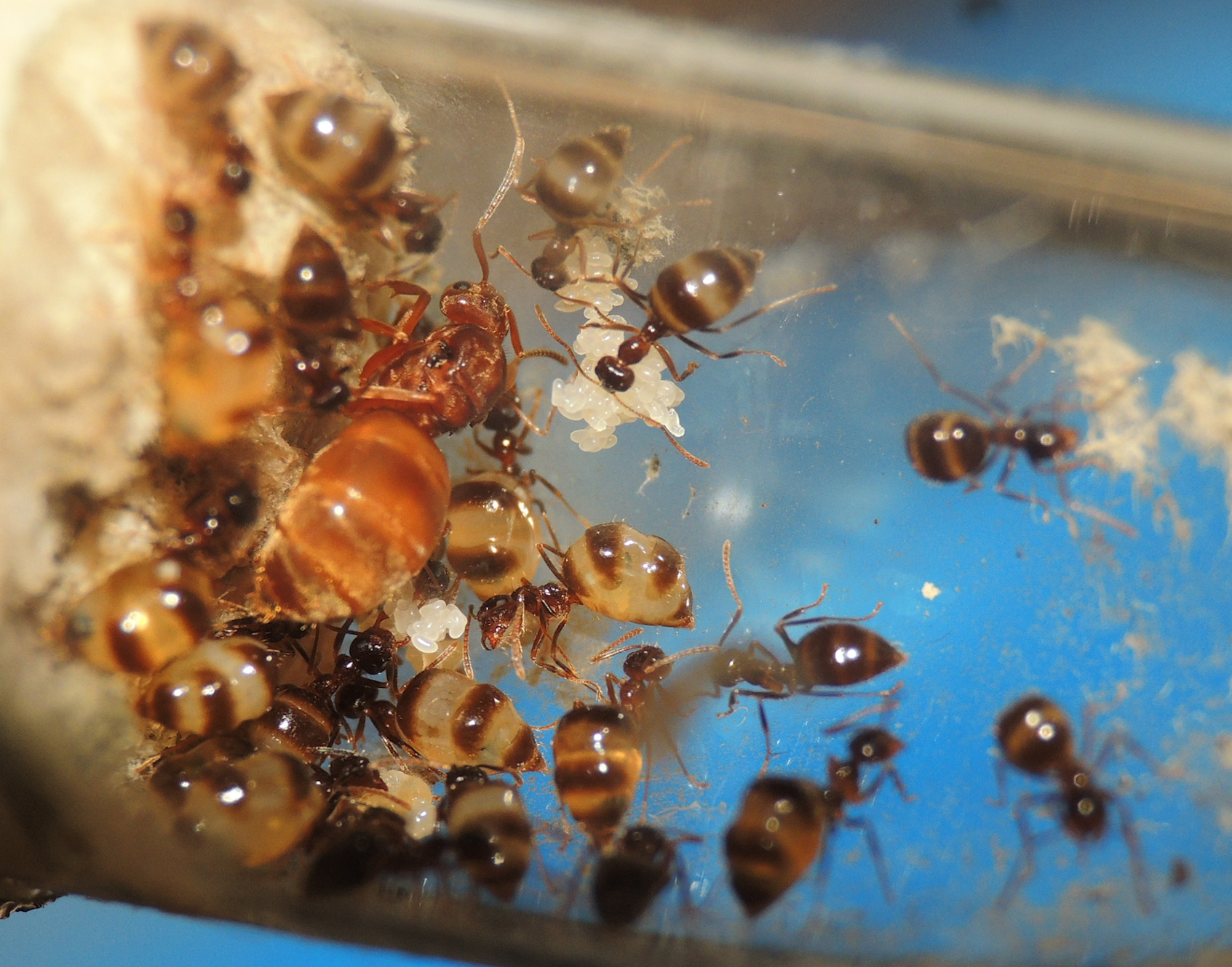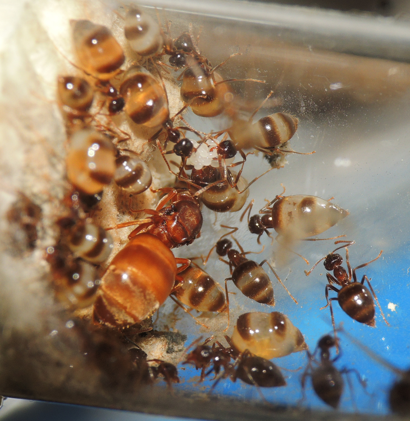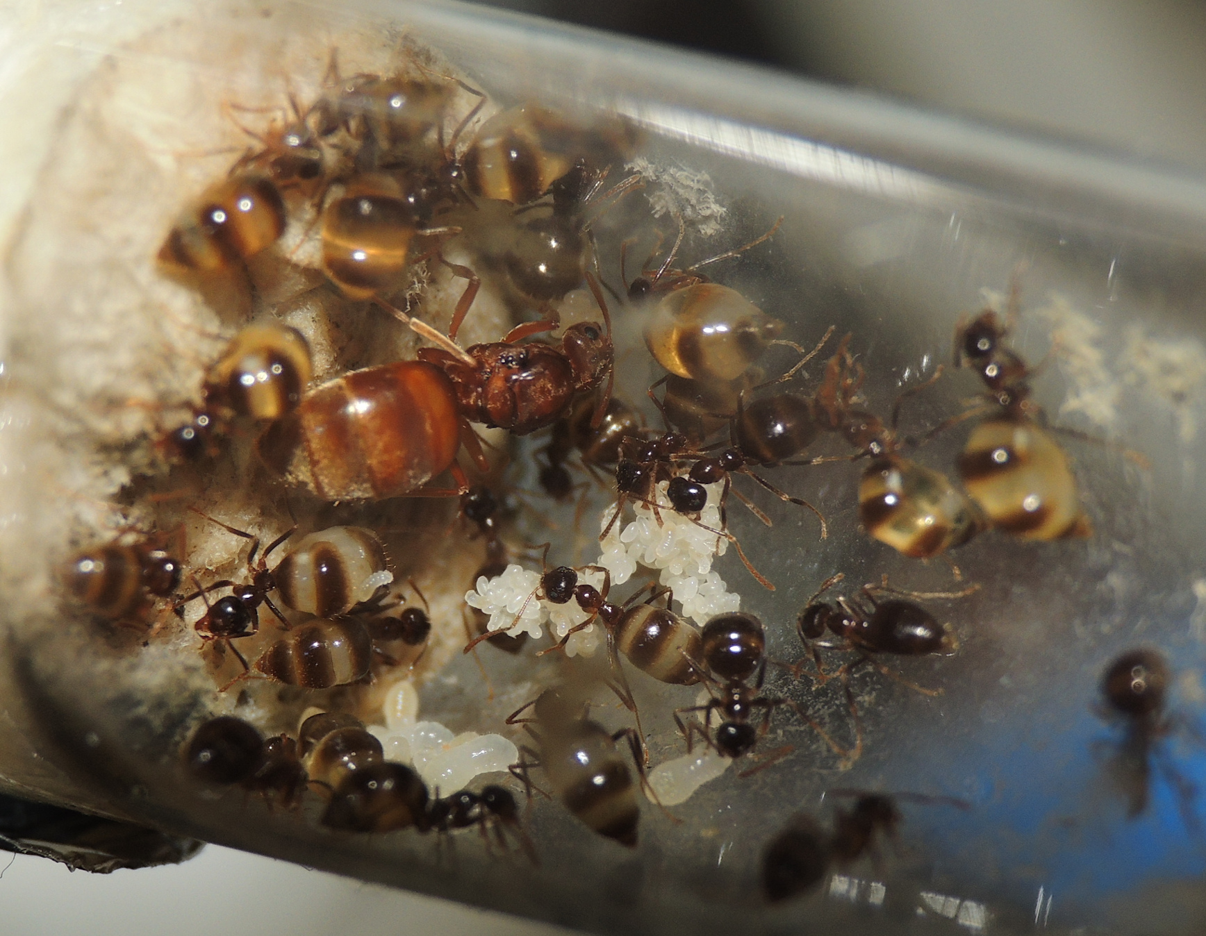 Nach einem problemreichen Jahr, mit mehreren Überschwemmungen im Reagenzglas und zahlreichen Verlusten, konnte ich den Großteil der Königinnen bislang durch mehrfaches Pushen mit Arbeiterinnen aus verschiedenen Naturnestern retten. Nahezu keine der Arbeiterinnen stammt von den Gynen ab.